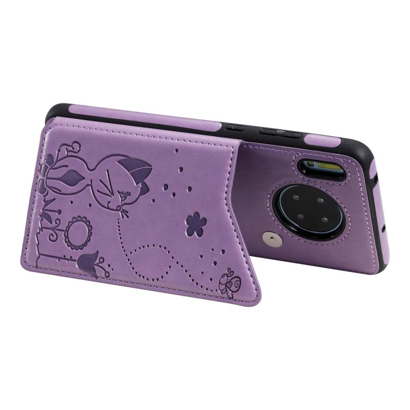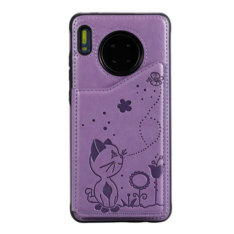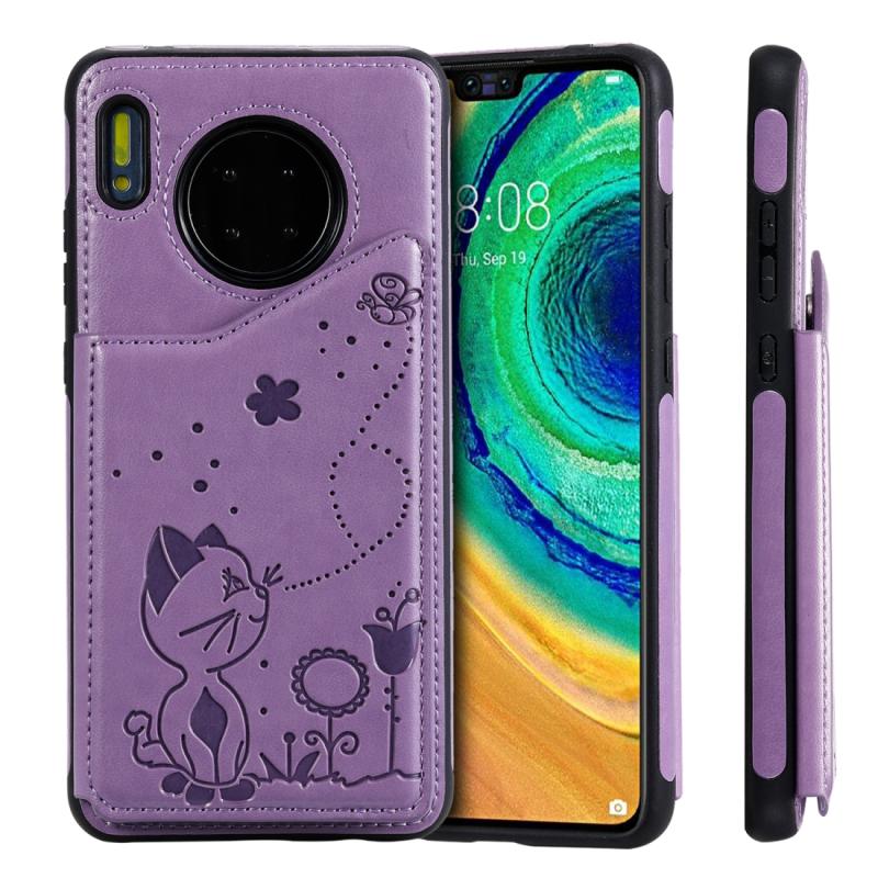 Θήκη προστασίας με ανάγλυφο σχέδιο "Cat Bee" για Huawei Mate 30, αντικραδασμική, με θήκες για κάρτες & κορνίζα φωτογραφιών (Μωβ)