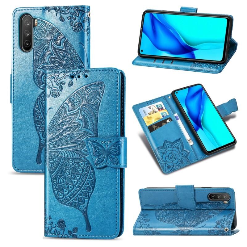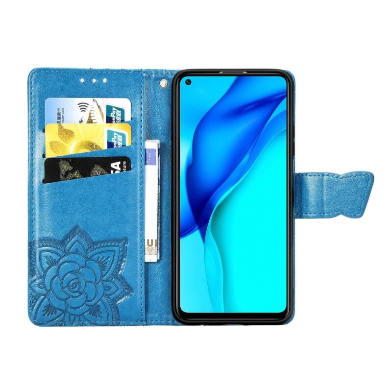 Θήκη δέρματος οριζόντιας αναδίπλωσης για Huawei Mate 40 Lite / Maimang 9 με ανάγλυφο σχέδιο πεταλούδας και λουλουδιών, με βάση στήριξης, θήκες καρτών, πορτοφόλι και κορδόνι (Μπλε)