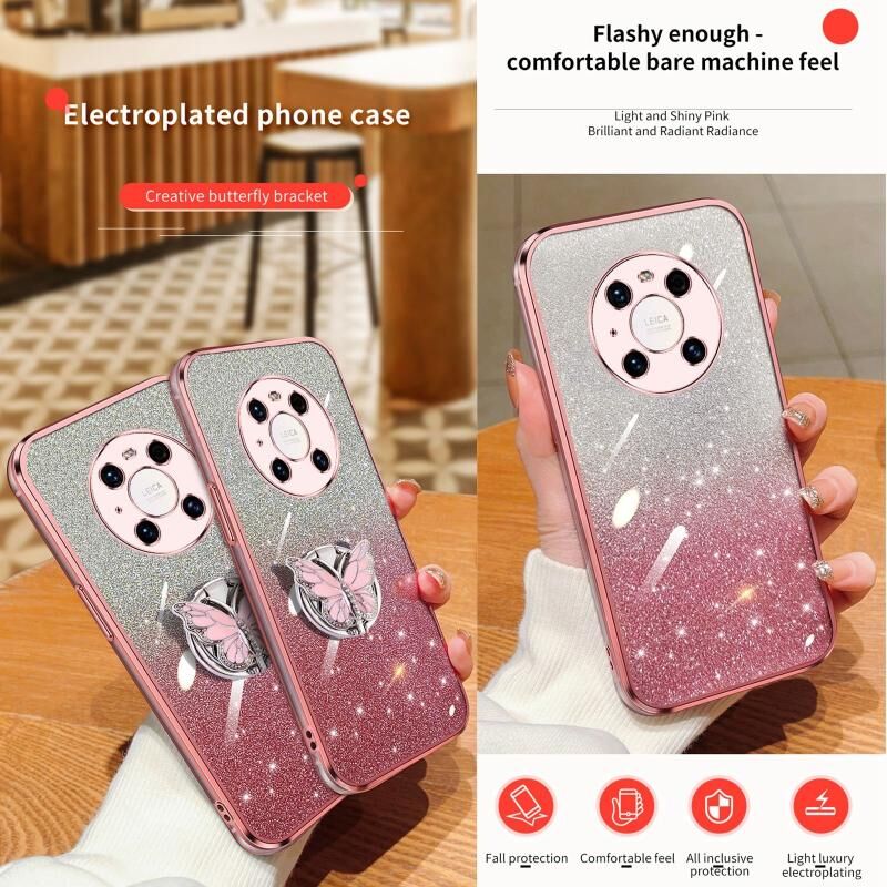 Θήκη κινητού τηλεφώνου Huawei Mate 40 Pro με επιμετάλλωση, διαβαθμισμένη λάμψη, σχέδιο πεταλούδας, από TPU (Ροζ)