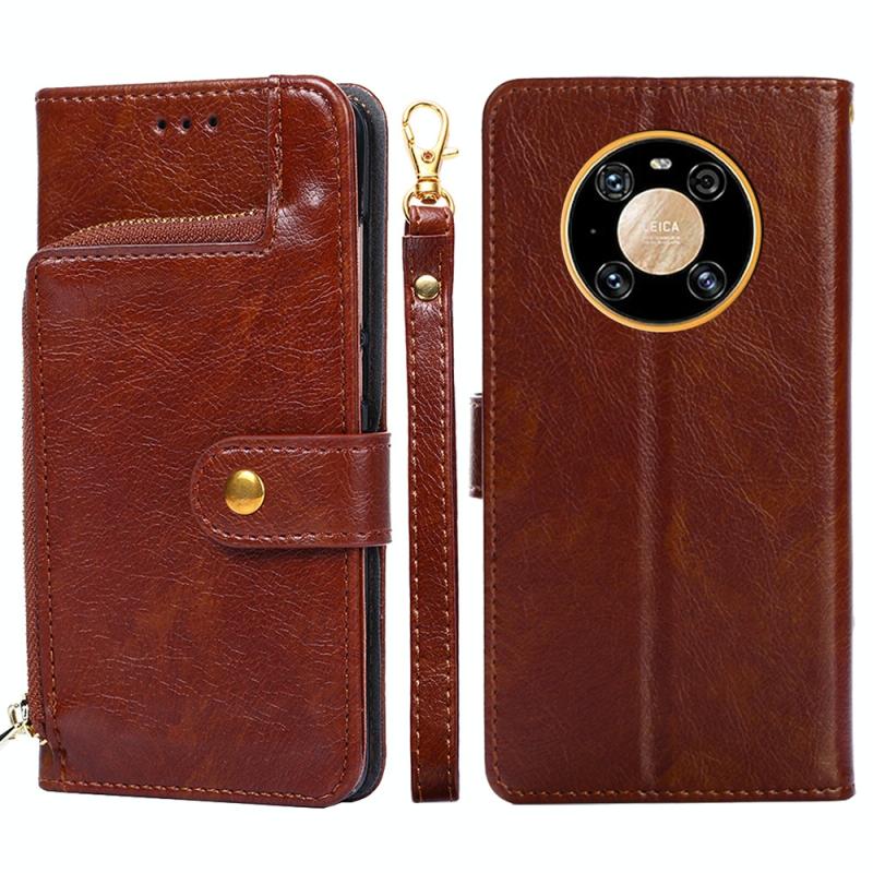 Θήκη Huawei Mate 40, Δερμάτινη οριζόντια θήκη με φερμουάρ, PU + TPU, με βάση, θήκη καρτών, πορτοφόλι & λουρί (Καφέ)