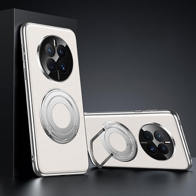 For Huawei Mate 50 Plain Leather Hydric Metal Holder MagSafe Phone Case(White)