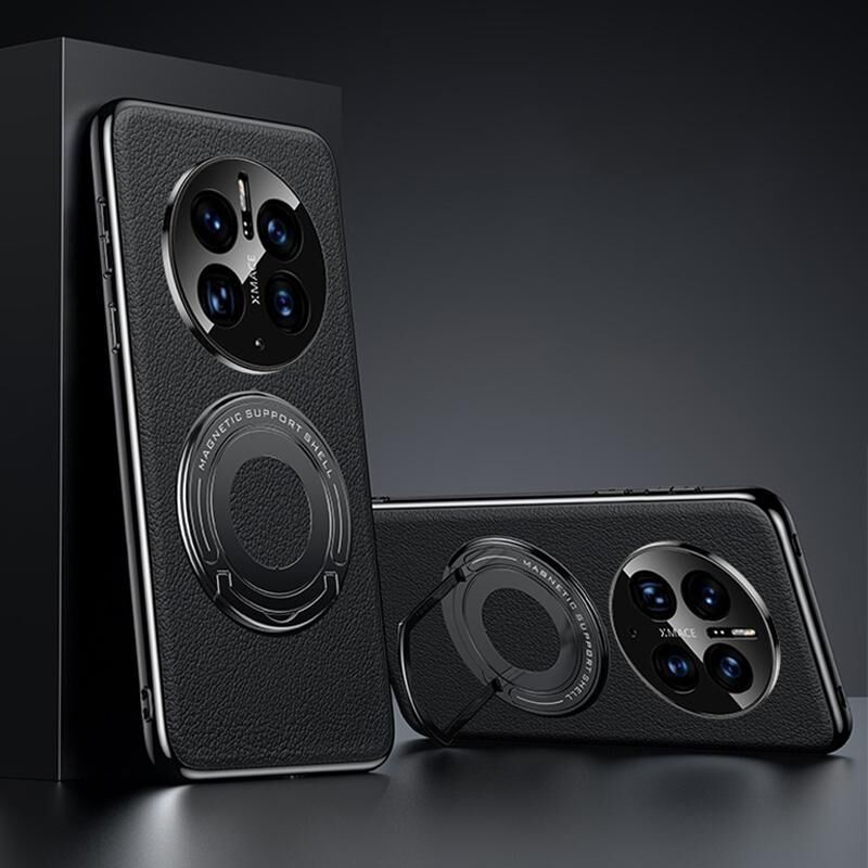 For Huawei Mate 50 Pro Plain Leather Hydric Metal Holder MagSafe Phone Case(Black)