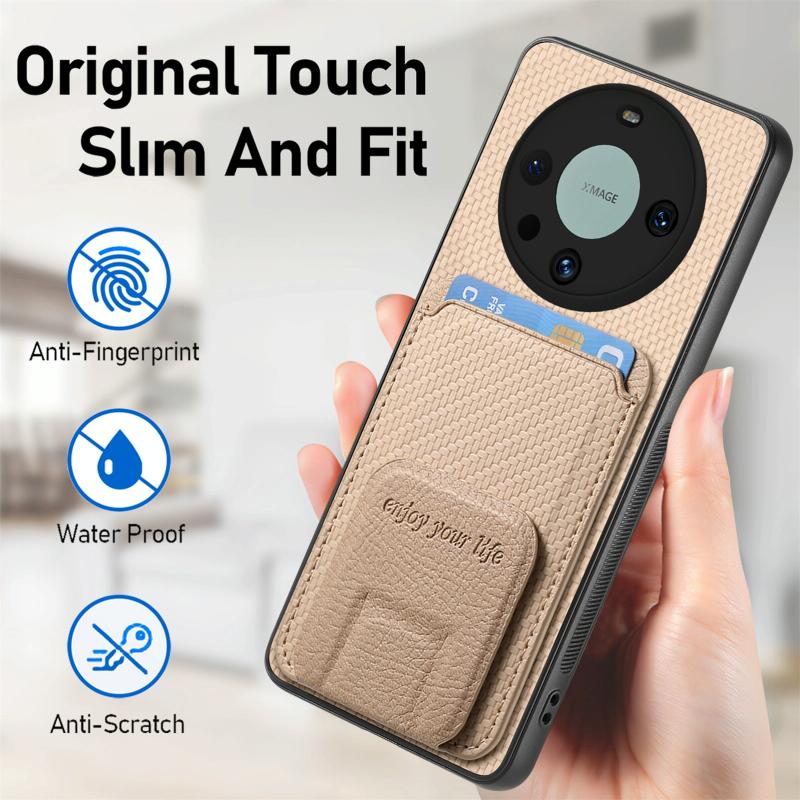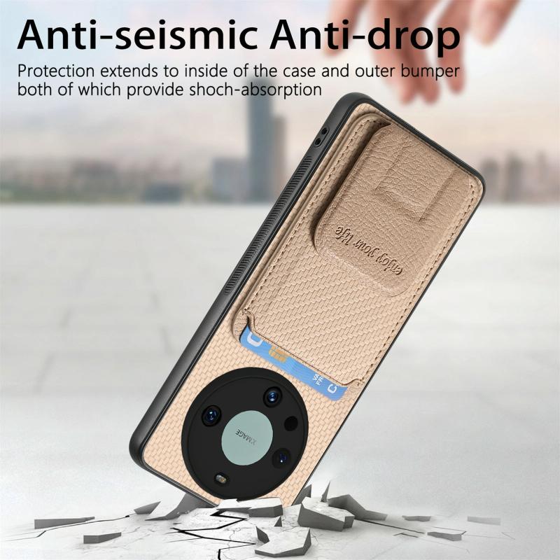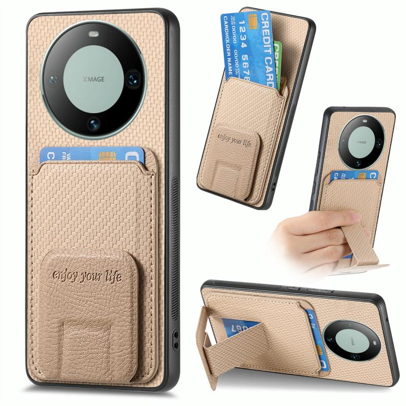 For Huawei Mate 60 Carbon Fiber Card Bag Fold Stand Phone Case(Khaki)