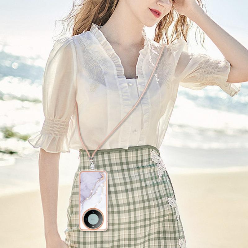 For Huawei Mate 60 Electroplating Marble Dual-side IMD Phone Case with Lanyard(White 006)