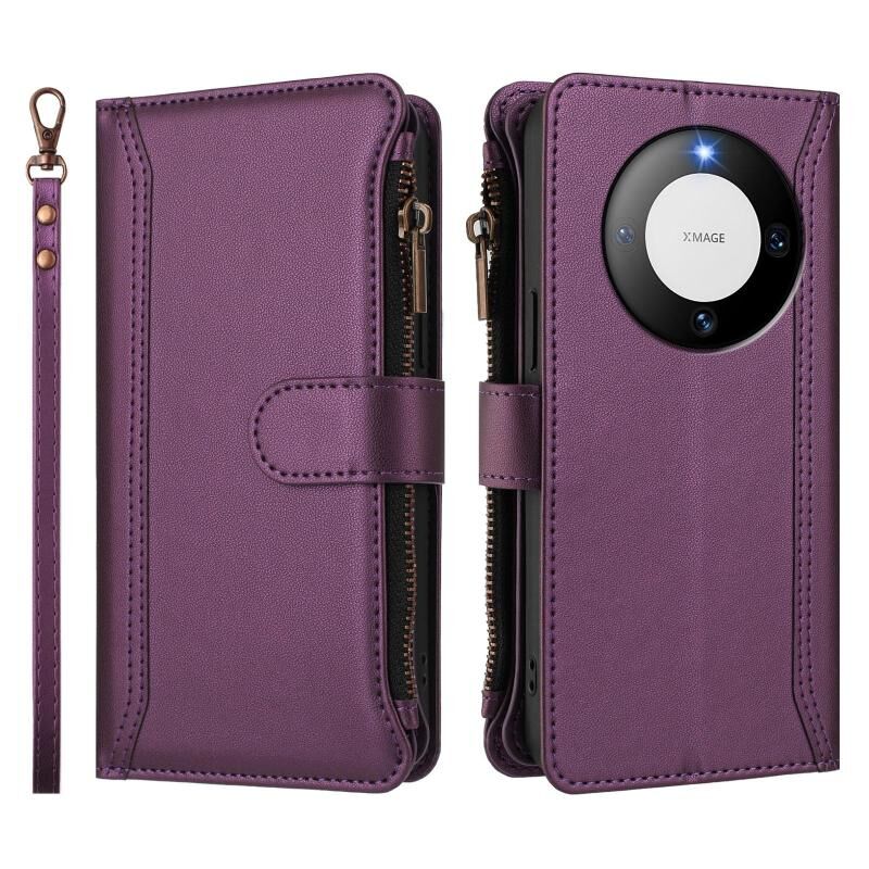 Θήκη δέρματος με μαγνητικό κλείσιμο, φερμουάρ και λουρί χειρός για Huawei Mate 60, χωρητικότητας 9 καρτών (Μωβ)