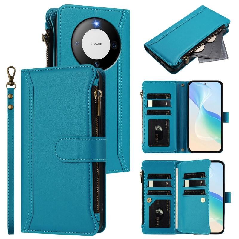 Θήκη δέρματος με μαγνητικό κλείσιμο, 9 θέσεις για κάρτες και φερμουάρ για Huawei Mate 60, με λουρί χειρός (Τουρκουάζ)