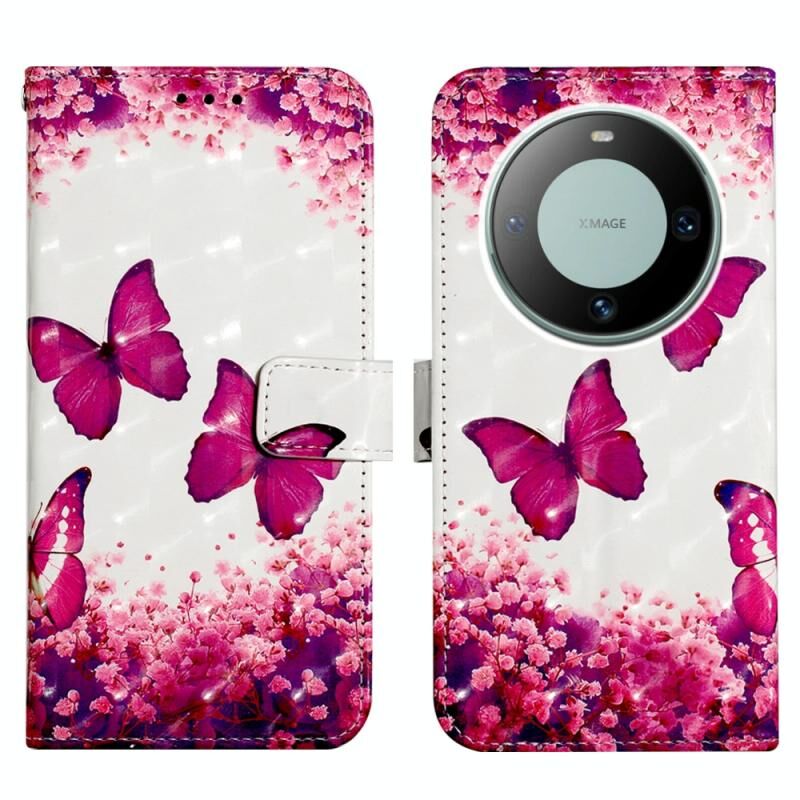 Θήκη τηλεφώνου από δέρμα με οριζόντιο άνοιγμα και τρισδιάστατη ζωγραφική για Huawei Mate 60 Pro (Ροζ Πεταλούδα)