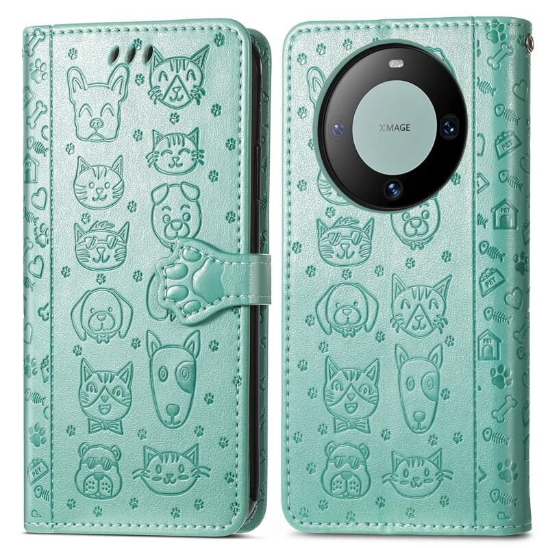 Θήκη τηλεφώνου Huawei Mate 60 Pro με ανάγλυφο σχέδιο γάτας και σκύλου από δέρμα (πράσινο)