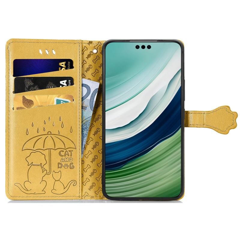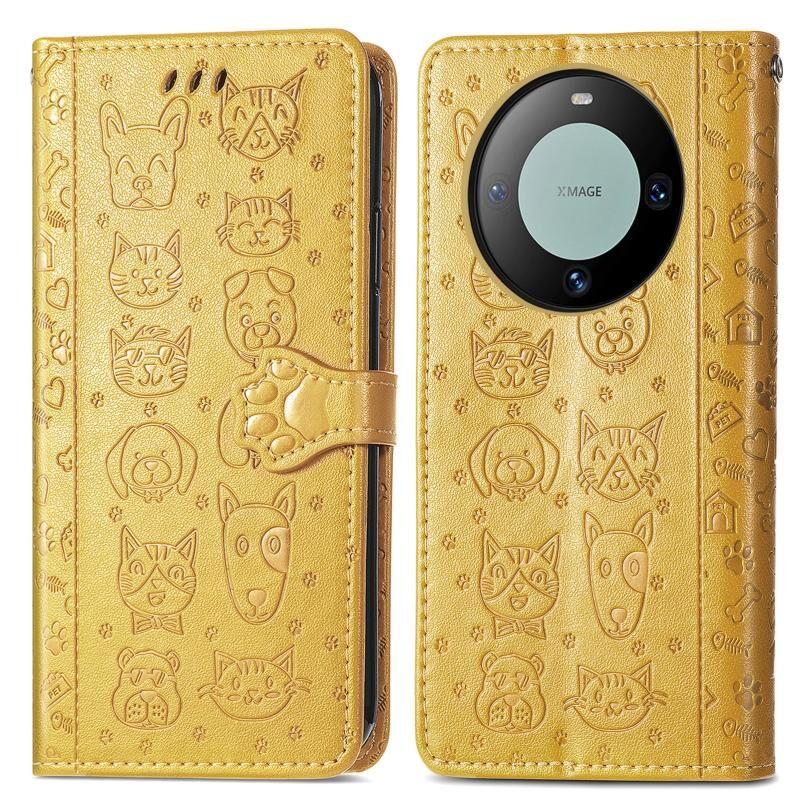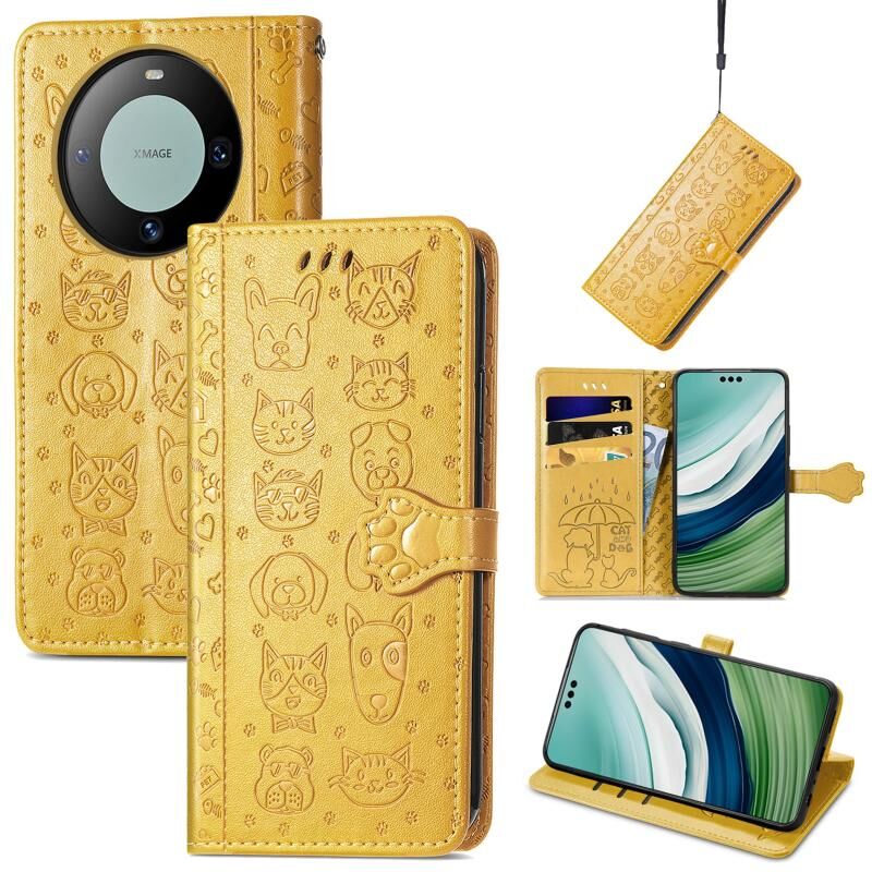 Θήκη τηλεφώνου Huawei Mate 60 Pro με ανάγλυφο σχέδιο γάτας και σκύλου από δέρμα (Κίτρινο)