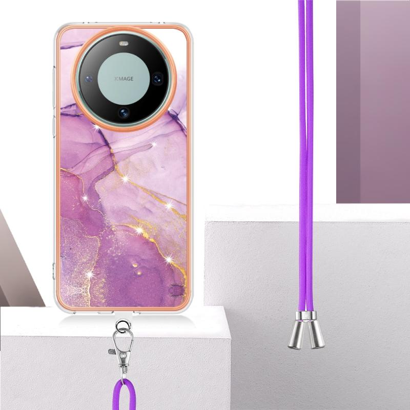 For Huawei Mate 60 Pro Electroplating Marble Dual-side IMD Phone Case with Lanyard(Purple 001)