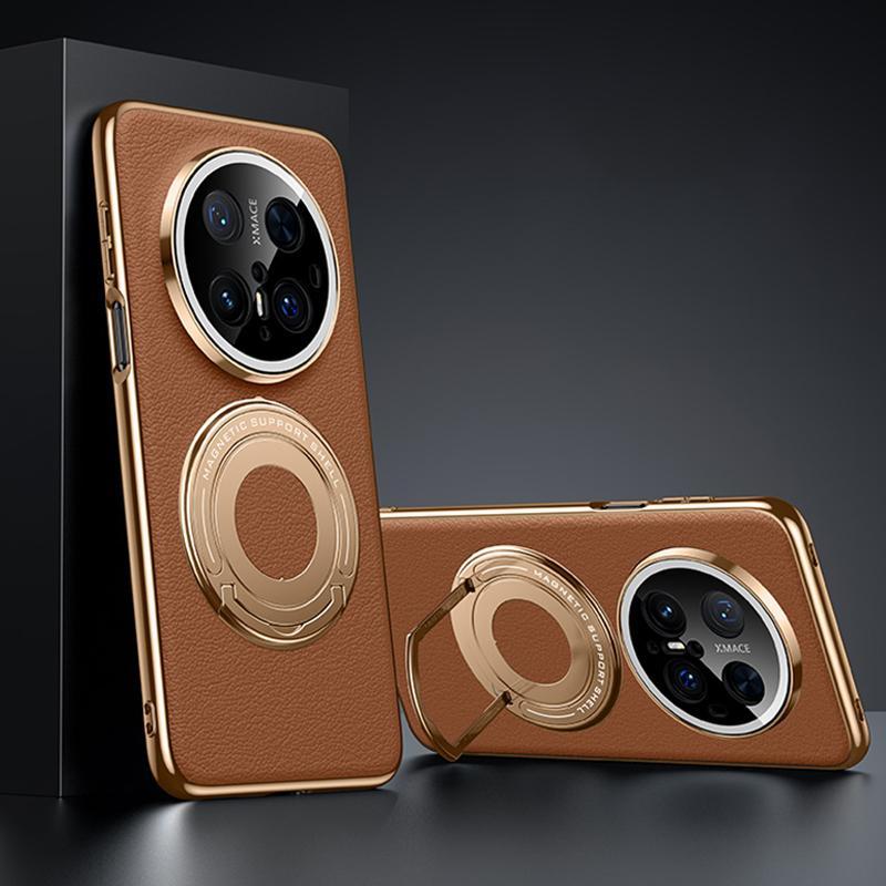 For Huawei Mate 70 Pro / Mate 70 Pro+ Plain Leather Hydric Metal Holder MagSafe Phone Case(Brown)