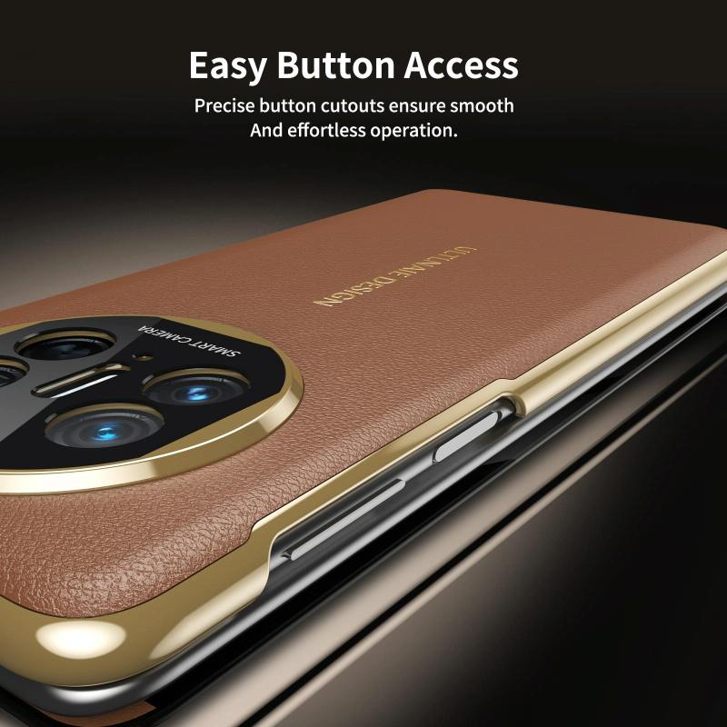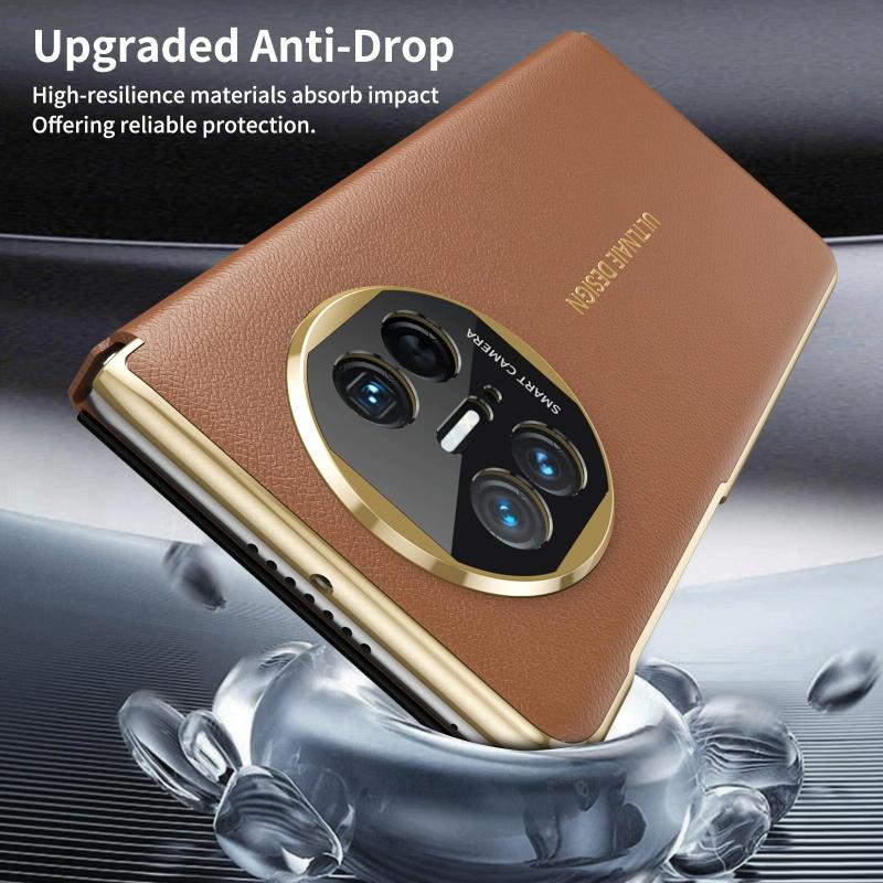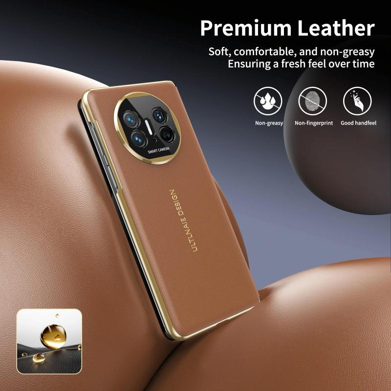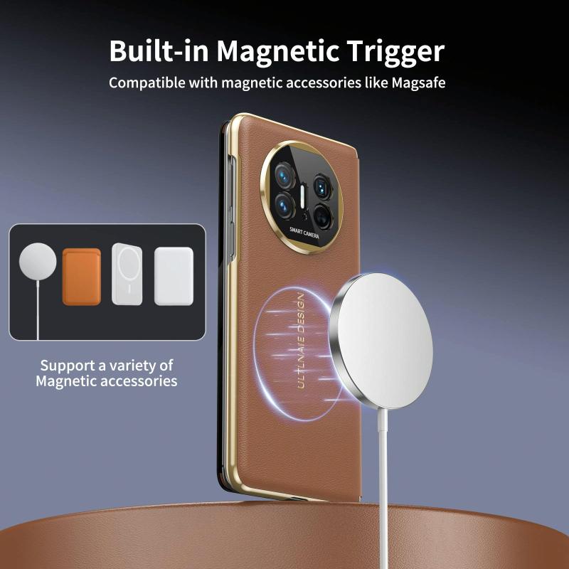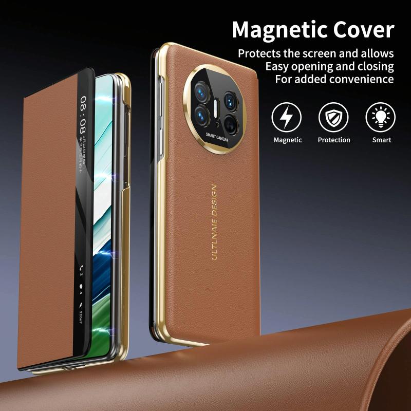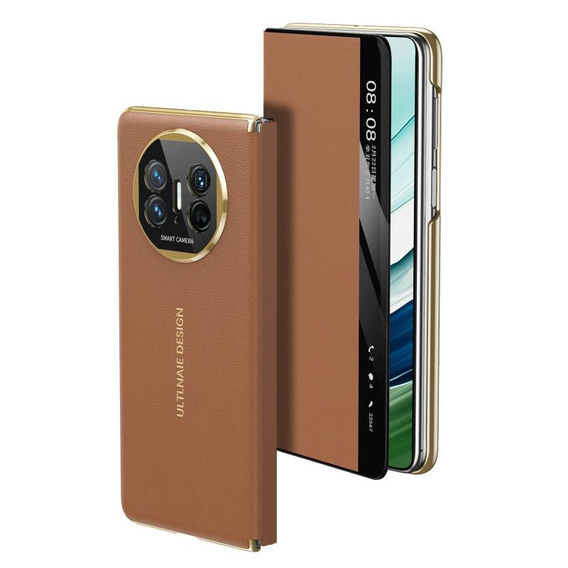 For Huawei Mate X5 Gold Flip Fold Smart Window MagSafe Leather Phone Case(Brown)