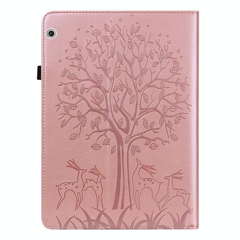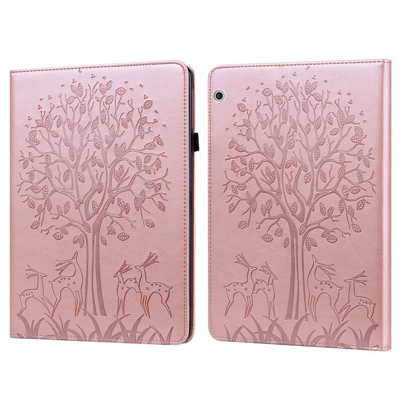 For Huawei MediaPad T3 10 Tree & Deer Pattern Pressed Printing Horizontal Flip PU Leather Case with Holder & Card Slots(Pink)