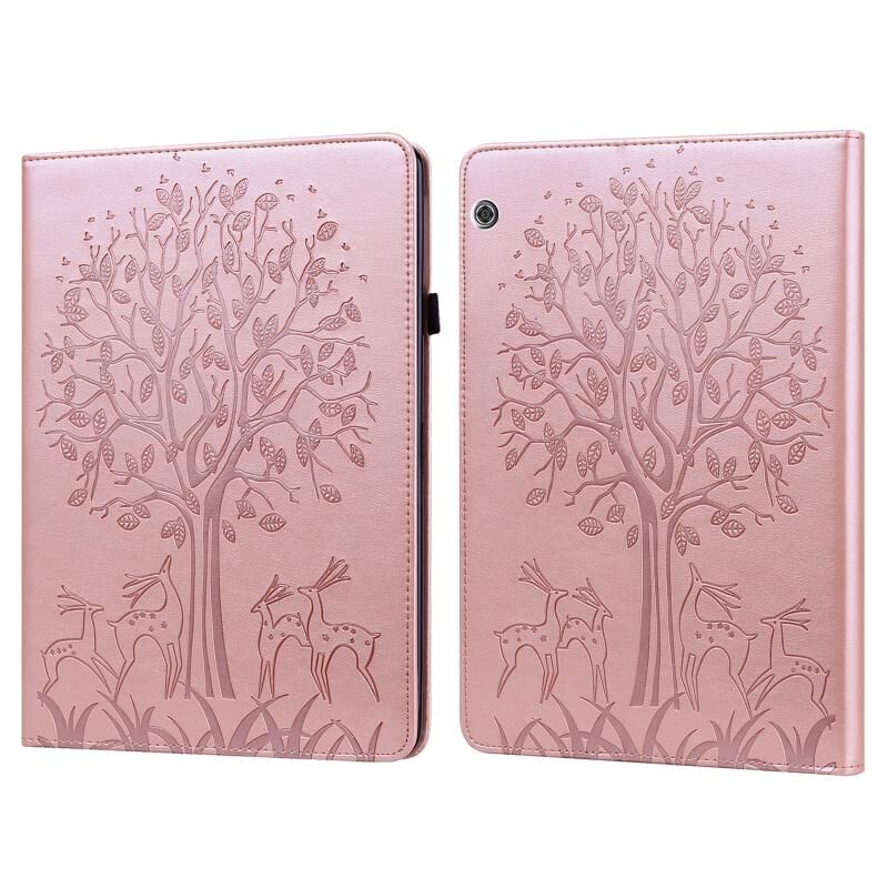 For Huawei MediaPad T5 Tree & Deer Pattern Pressed Printing Horizontal Flip PU Leather Case with Holder & Card Slots(Pink)