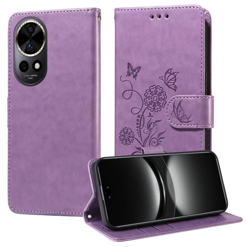 Θήκη τηλεφώνου από δέρμα με ανάγλυφα λουλούδια και πεταλούδες για Huawei nova 12 Pro / nova 12 Ultra (Μωβ)