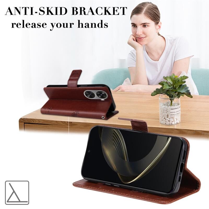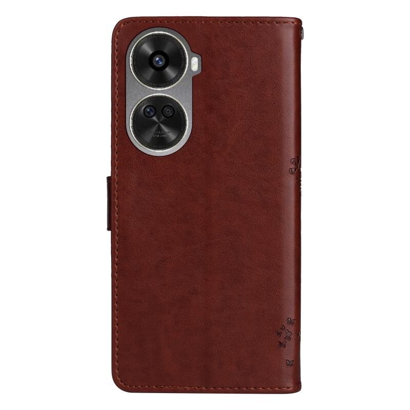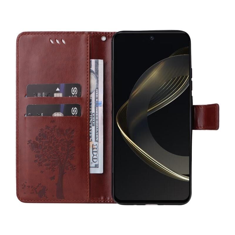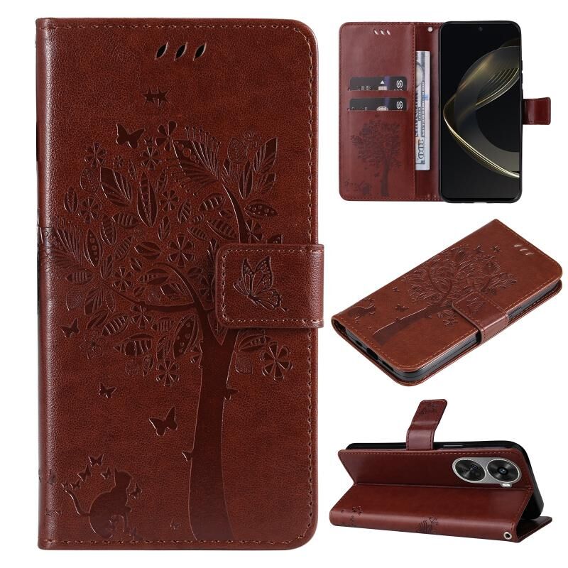 Για Huawei nova 12 SE / nova 11 SE Tree & Cat ανάγλυφο μοτίβο Flip δερμάτινη θήκη τηλεφώνου (καφέ)