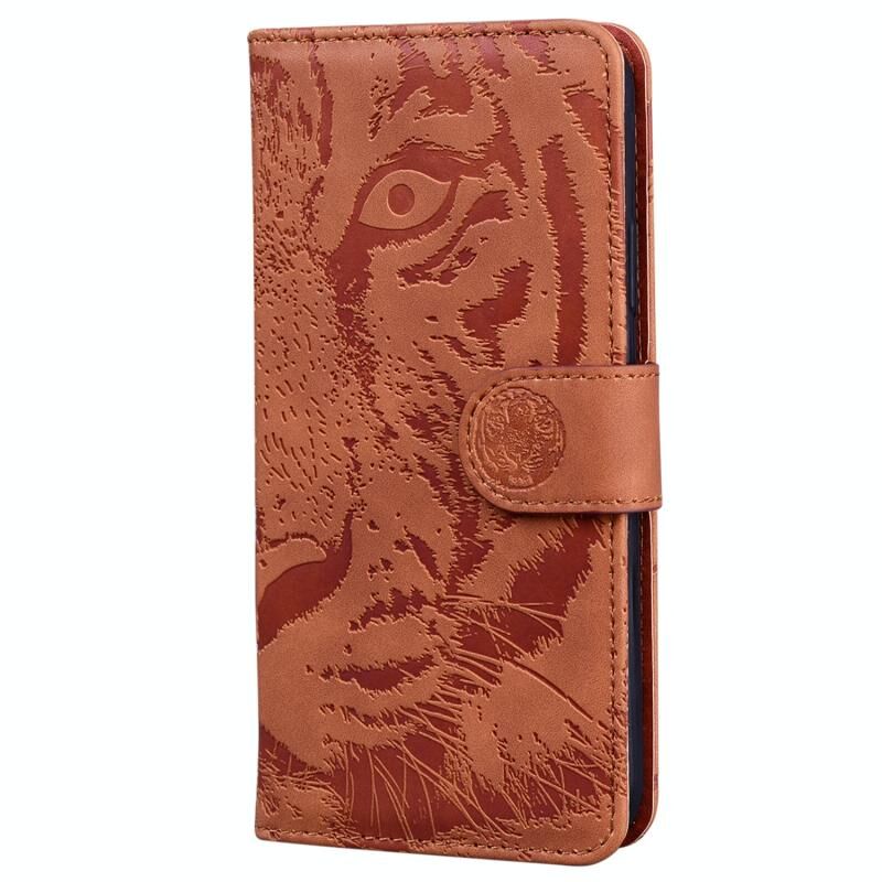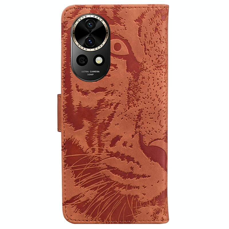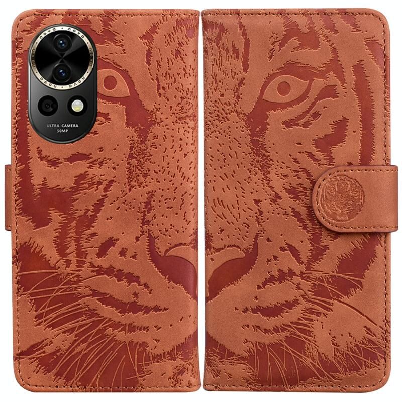 Θήκη τηλεφώνου Huawei nova 12 με ανάγλυφο σχέδιο τίγρης, δερμάτινη, τύπου flip (Καφέ)