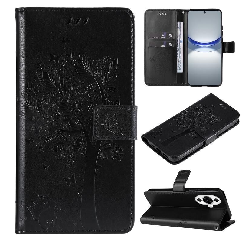 Για Huawei nova 12s δέντρο & Cat ανάγλυφο μοτίβο Flip δέρμα τηλέφωνο υπόθεση (μαύρο)