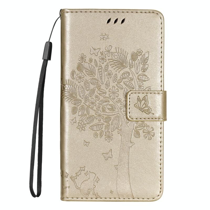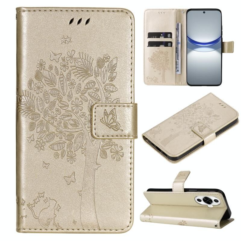 Για Huawei nova 12s δέντρο & Cat ανάγλυφο μοτίβο Flip δέρμα τηλέφωνο υπόθεση (χρυσό)
