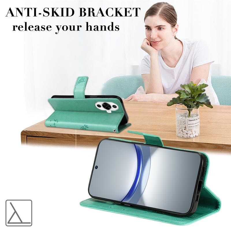Για Huawei nova 12s δέντρο & Cat ανάγλυφο μοτίβο Flip δερμάτινη θήκη τηλεφώνου (πράσινο)