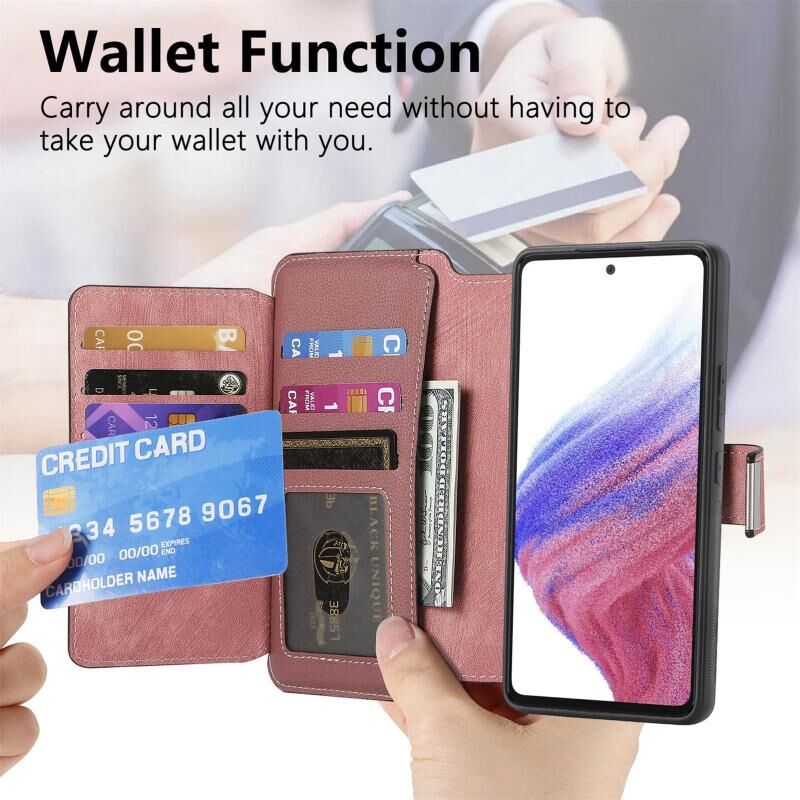 2. Λειτουργία πορτοφολιού με φερμουάρ: Η δερμάτινη θήκη είναι εξοπλισμένη με πορτοφόλι με φερμουάρ και υποδοχές για κάρτες για την τοποθέτηση καρτών και μικρού ποσού μετρητών.