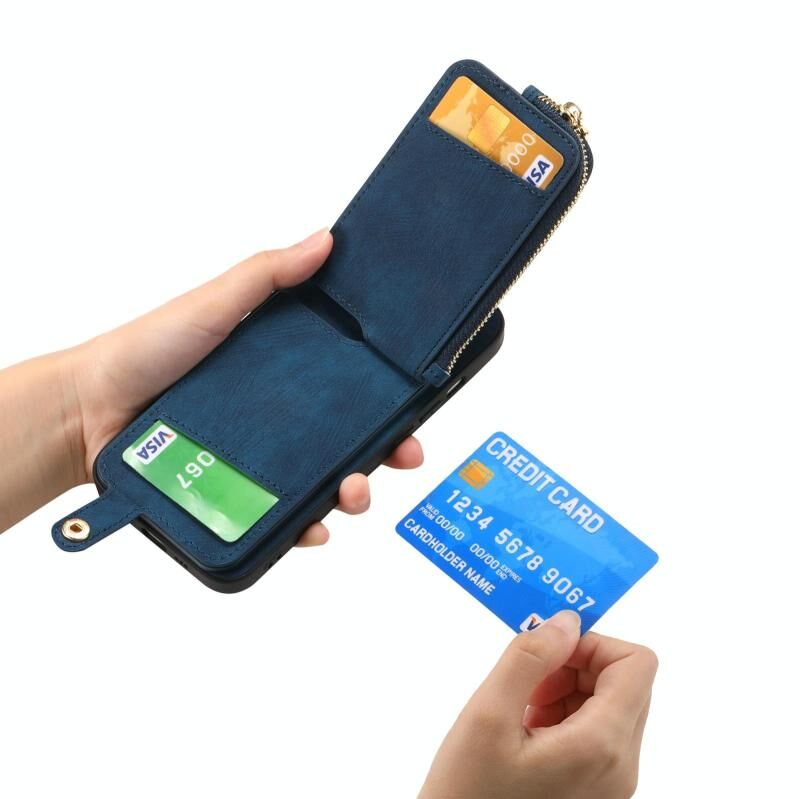 2. Λειτουργία Πορτοφολιού με Φερμουάρ: Η δερμάτινη θήκη είναι εξοπλισμένη με υποδοχές για κάρτες και ένα μικρό ποσό μετρητών.