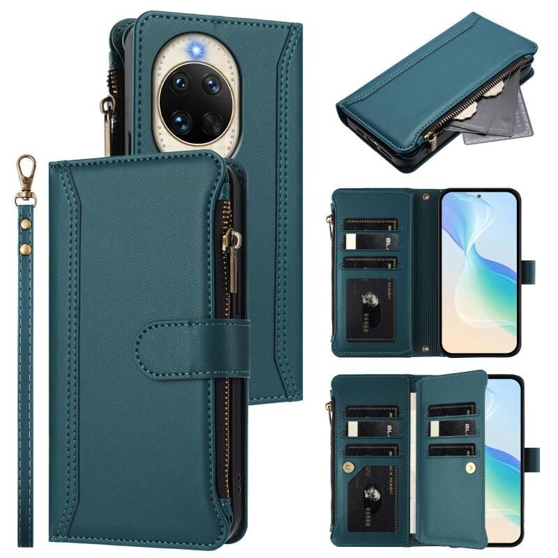 Για Huawei nova 14 Μαγνητικό Κλείσιμο 9 Θήκες Κάρτας Δερμάτινη Θήκη με Φερμουάρ και Λουρί Χεριού (Σκούρο πράσινο)
