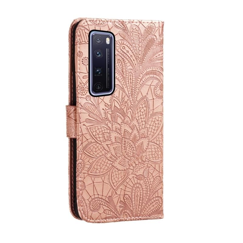 Θήκη Huawei Nova 7 Pro, δερμάτινη, οριζόντια αναδιπλούμενη με ανάγλυφο σχέδιο δαντέλας, με βάση, θήκες καρτών, πορτοφόλι, κορνίζα φωτογραφιών & λουρί (Μαύρο)