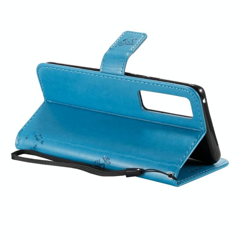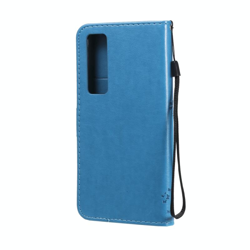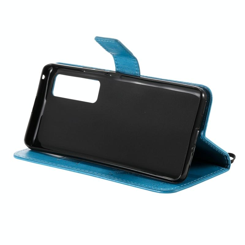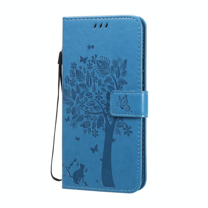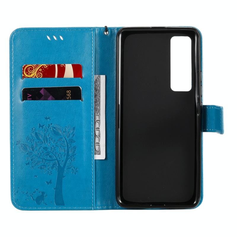 Θήκη Huawei Nova 7 Pro Δερμάτινη Οριζόντια Flip με ανάγλυφο σχέδιο Δέντρου & Γάτας, με βάση στήριξης, θήκες καρτών, πορτοφόλι & λουρί (Μπλε)