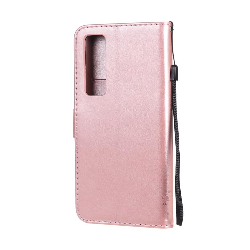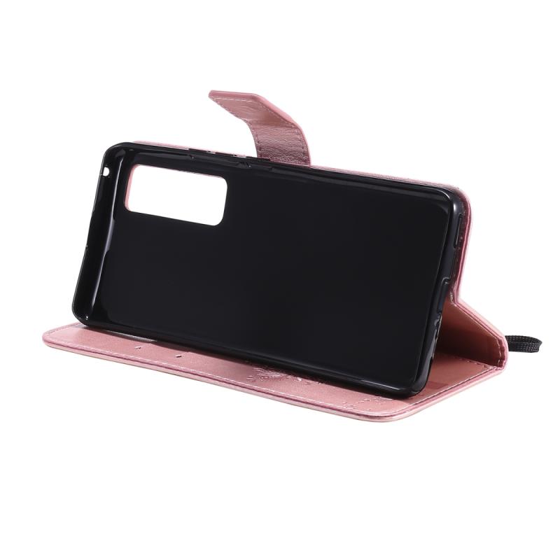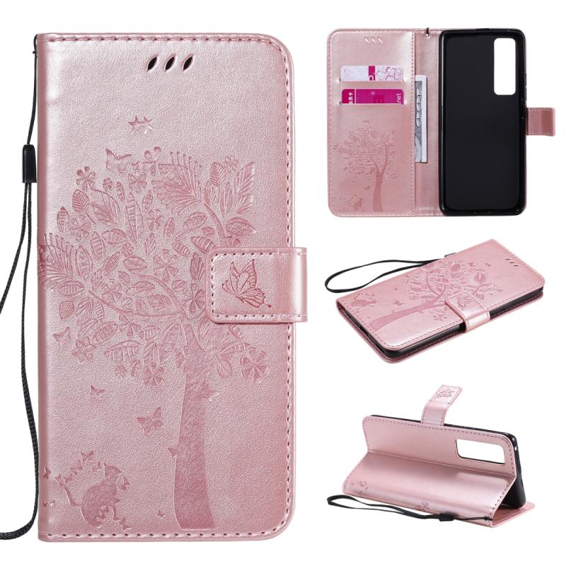 Θήκη Huawei Nova 7 Pro Δερμάτινη Οριζόντια Flip με ανάγλυφο σχέδιο Δέντρου & Γάτας, με βάση στήριξης, θήκες καρτών, πορτοφόλι & λουρί (Ροζ χρυσός)
