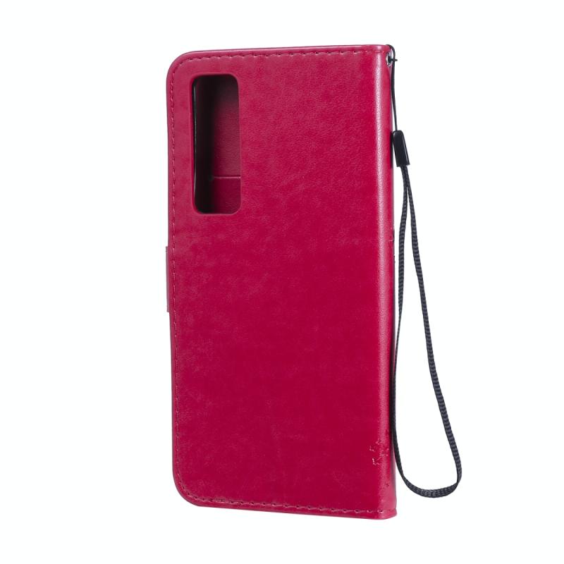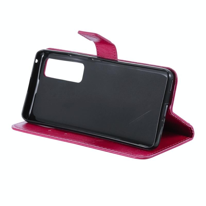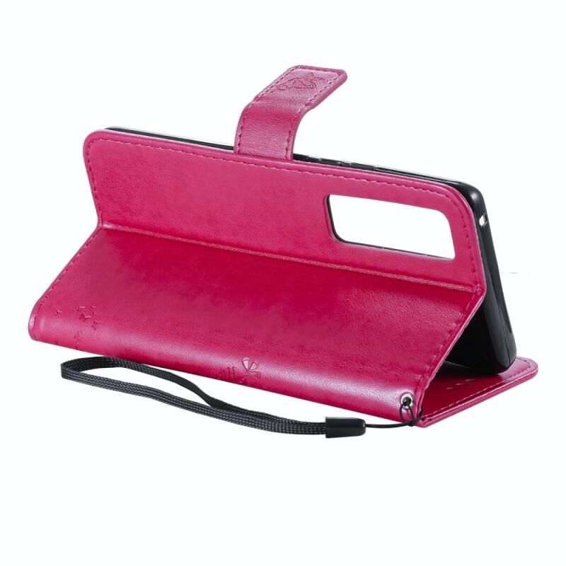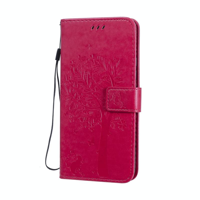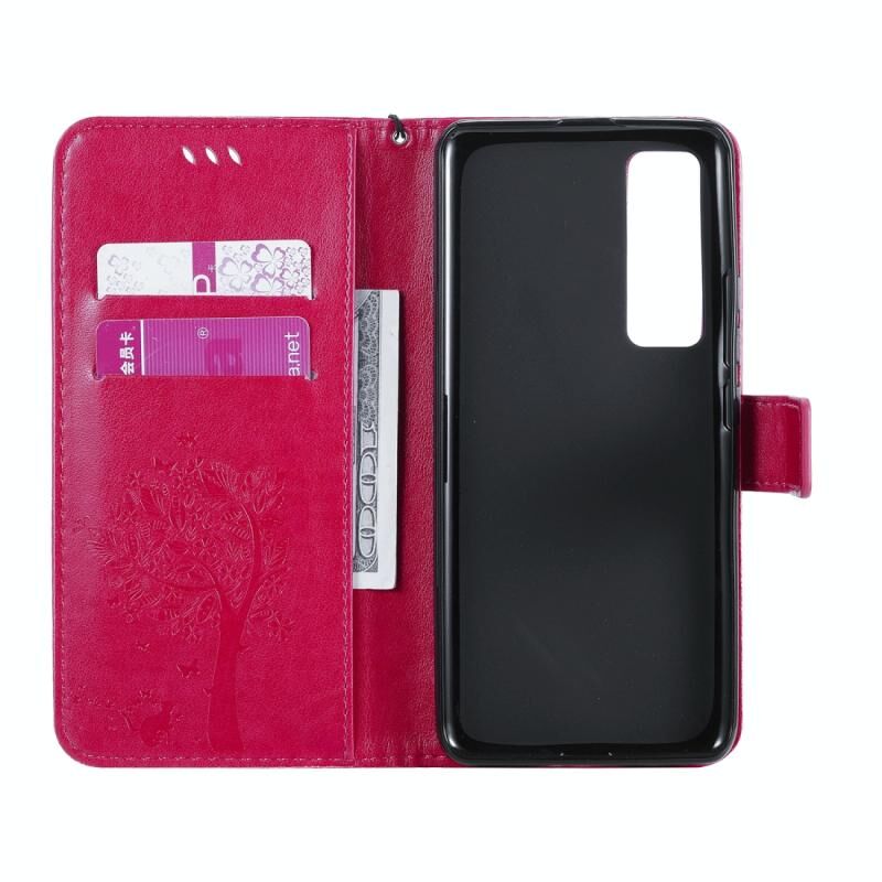 Θήκη Huawei Nova 7 Pro, Δερμάτινη οριζόντια θήκη με ανάγλυφο σχέδιο δέντρου & γάτας, με βάση στήριξης & θήκες για κάρτες & πορτοφόλι & λουρί (Ροζέ κόκκινο)