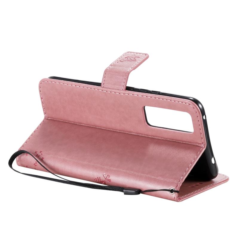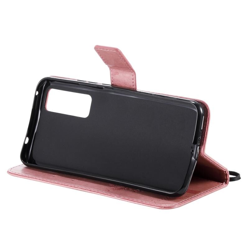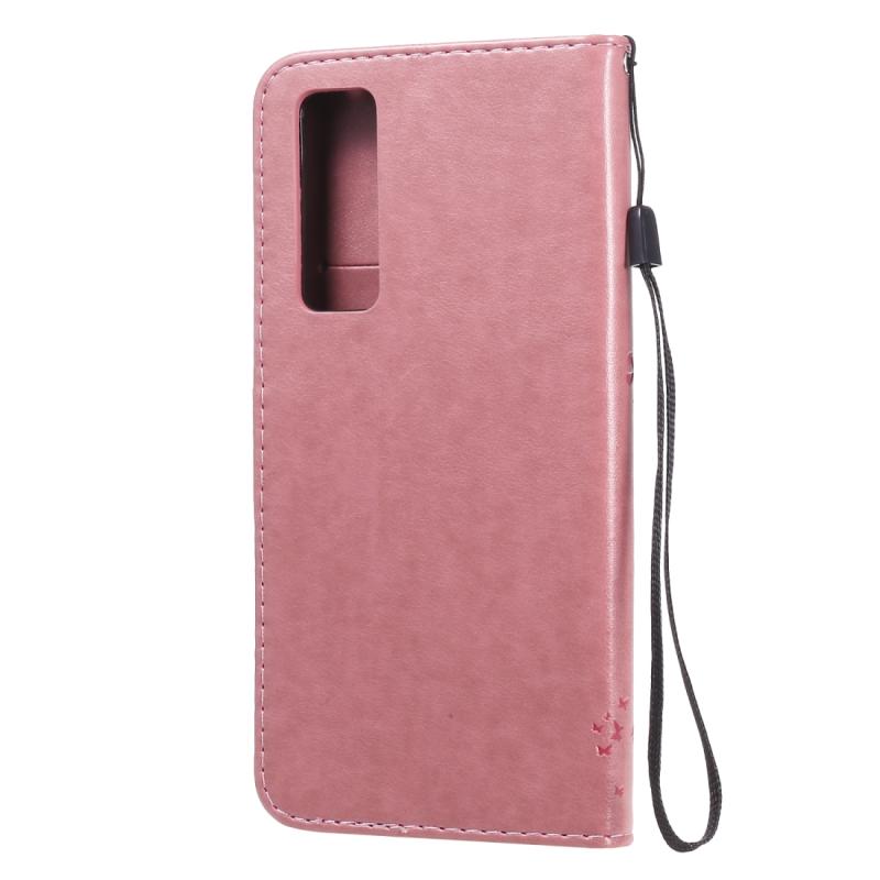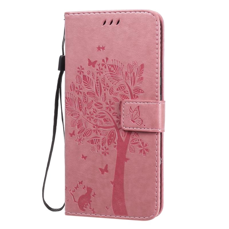 Θήκη Huawei Nova 7, Δερμάτινη, Οριζόντια, με ανάγλυφο σχέδιο Δέντρου & Γάτας, με βάση στήριξης, θήκες για κάρτες, πορτοφόλι & λουρί (ρόζ)