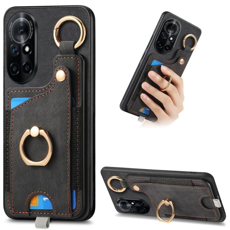 Για την Huawei nova 8 Ρετρό δέρμα-feel δαχτυλίδι κάρτα τσάντα υπόθεση τηλεφώνου με Hang Loop (Μαύρο)