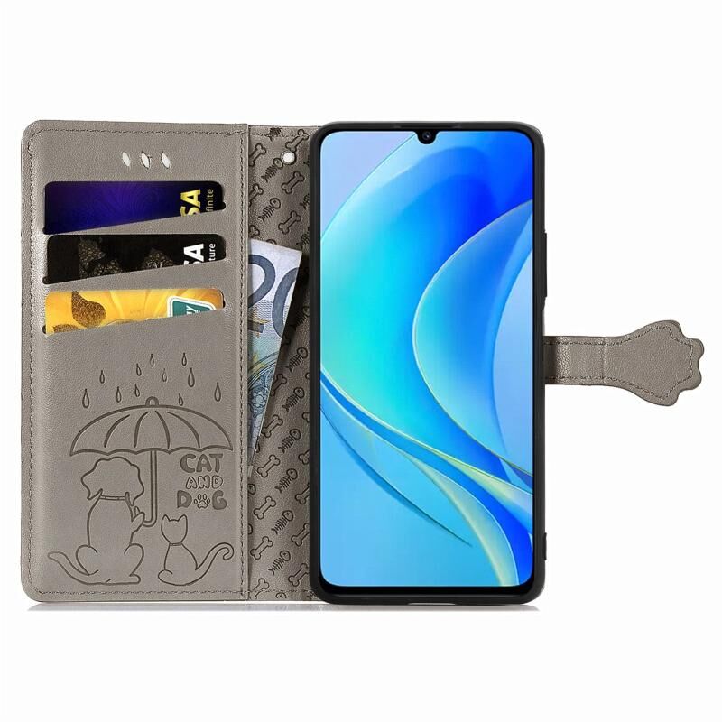 Θήκη τηλεφώνου από δέρμα με ανάγλυφα σχέδια γατιού και σκύλου για Huawei Nova Y70 (Γκρι)