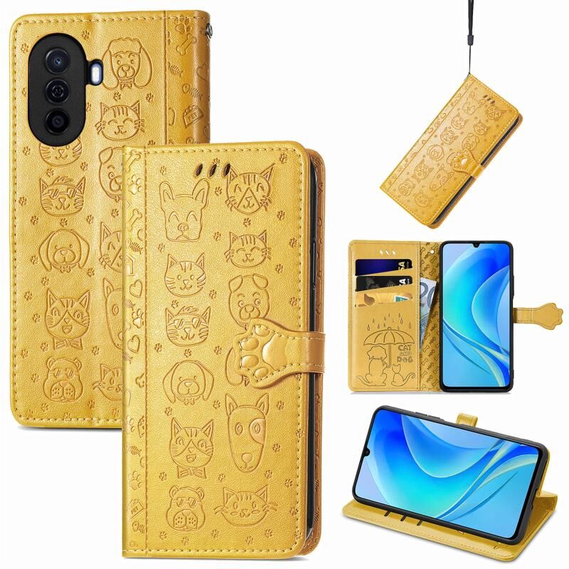 Θήκη τηλεφώνου από δέρμα με ανάγλυφα σχέδια γατιού και σκύλου για Huawei Nova Y70 (Μωβ)