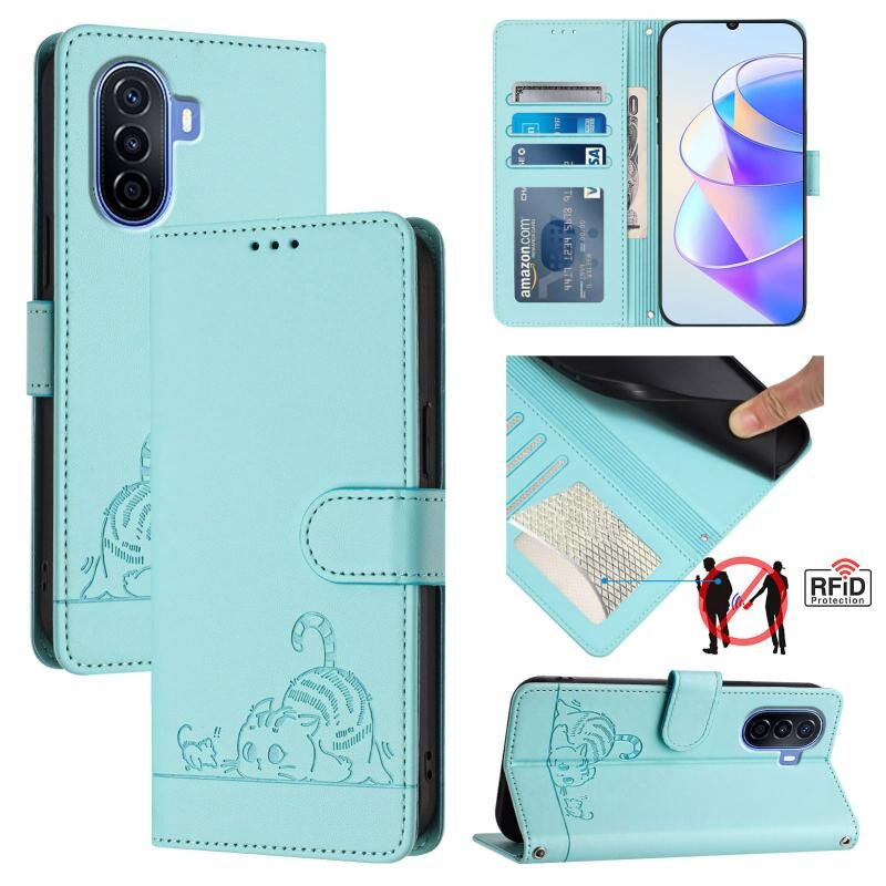 Θήκη τηλεφώνου Huawei nova Y70 Plus από δέρμα με ανάγλυφο σχέδιο γάτας και ποντικιού, με κορδόνι (Μέντας Πράσινο)