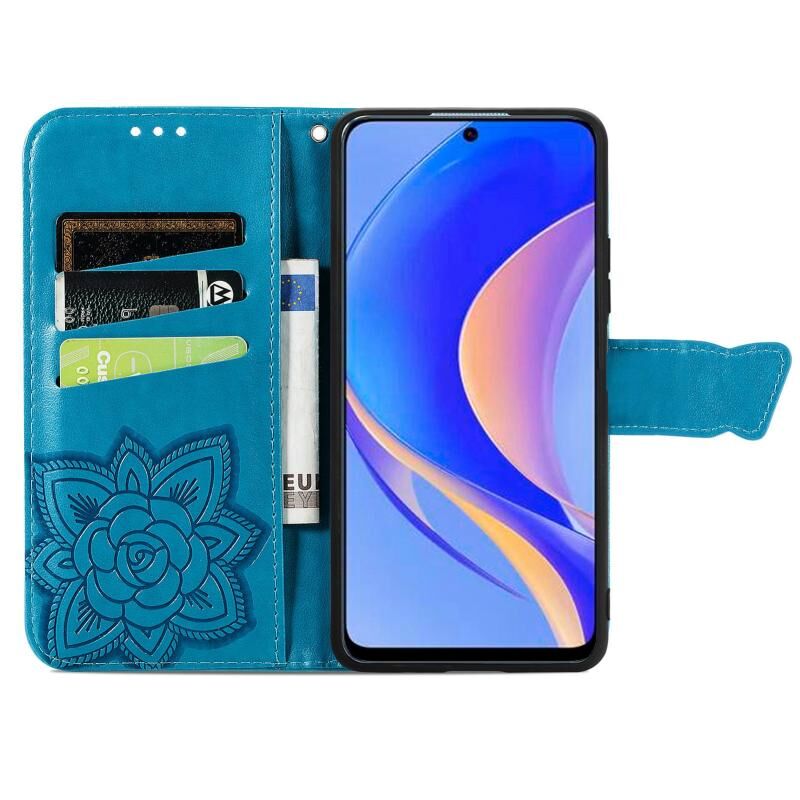Θήκη Huawei nova Y90 Butterfly Love Flower ανάγλυφη οριζόντια δερμάτινη με βάση / υποδοχή κάρτας / πορτοφόλι / κορδόνι (Μπλε)