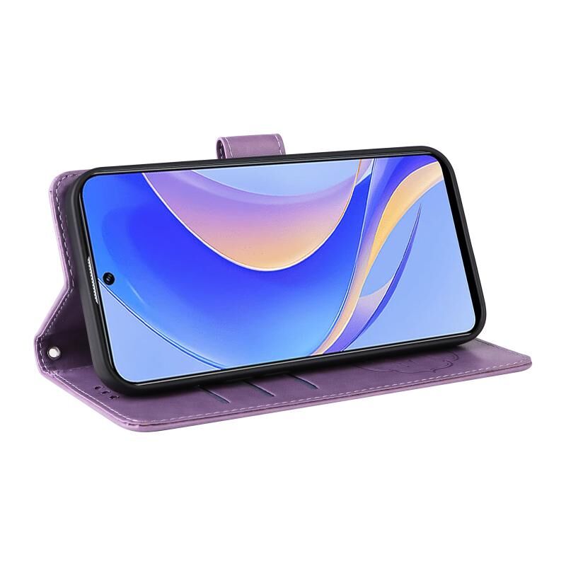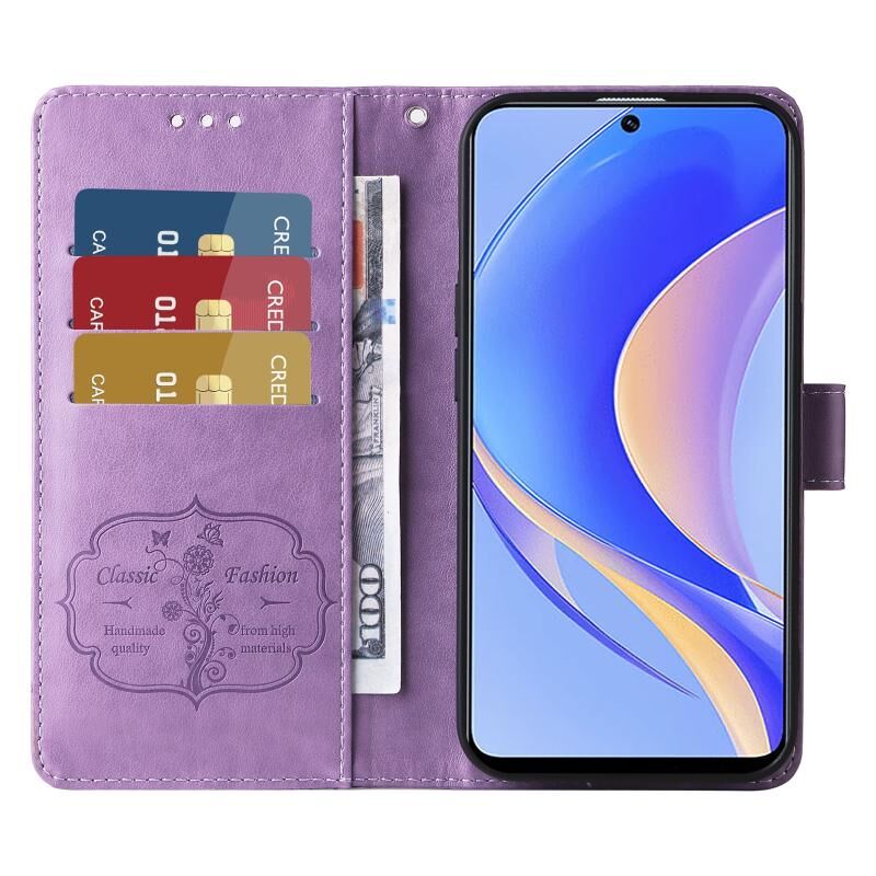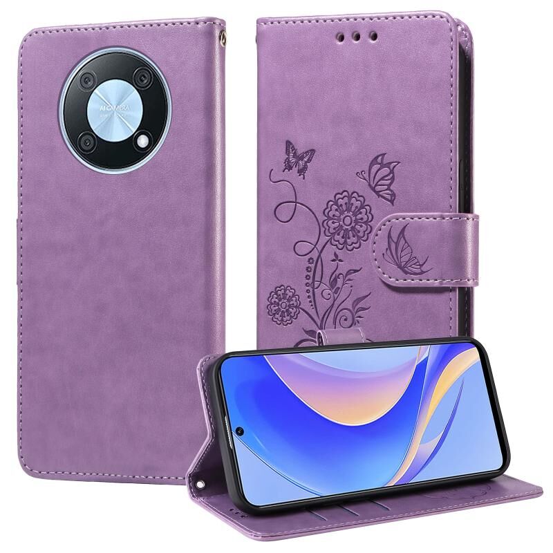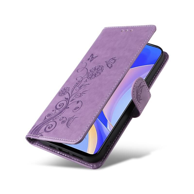 Θήκη τηλεφώνου δερμάτινη με ανάγλυφα λουλούδια και πεταλούδες για Huawei nova Y90 (Μωβ)