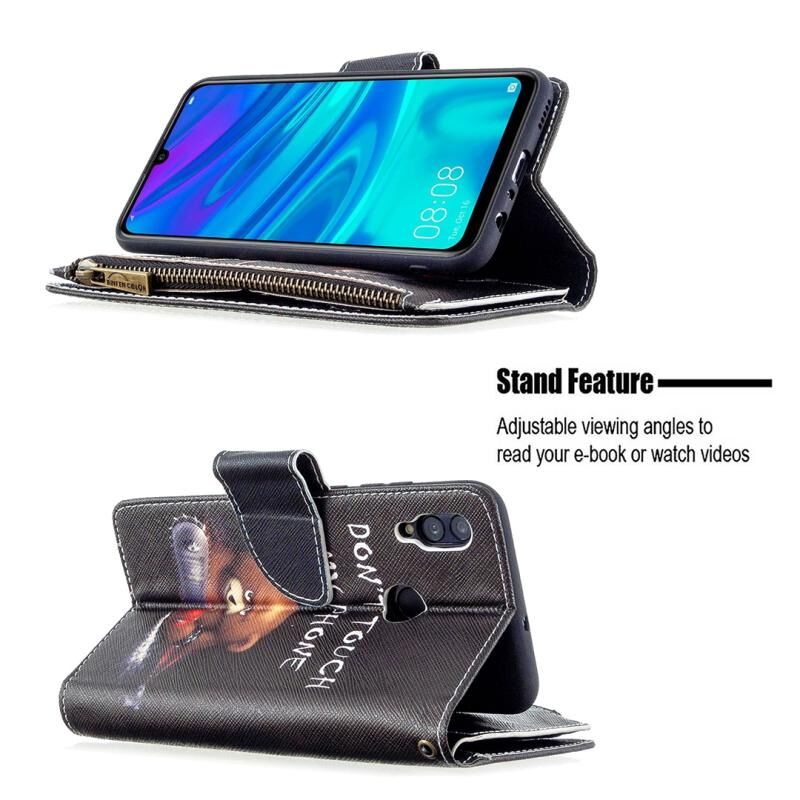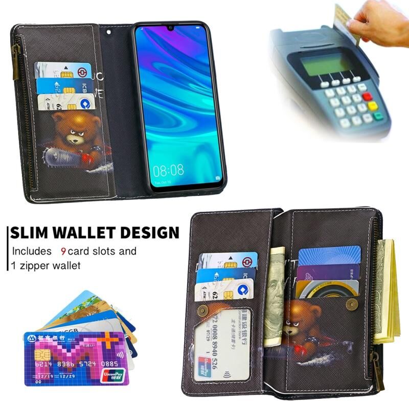 Θήκη δέρματος οριζόντιας αναδίπλωσης με φερμουάρ και σχέδιο ζωγραφικής για Huawei P Smart (2019) με βάση στήριξης & υποδοχές καρτών & πορτοφόλι (Αρκούδα)