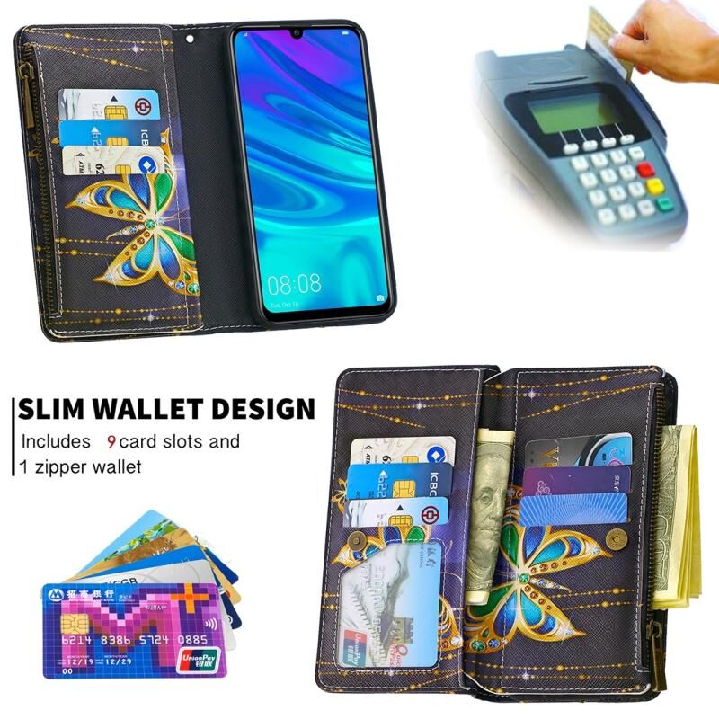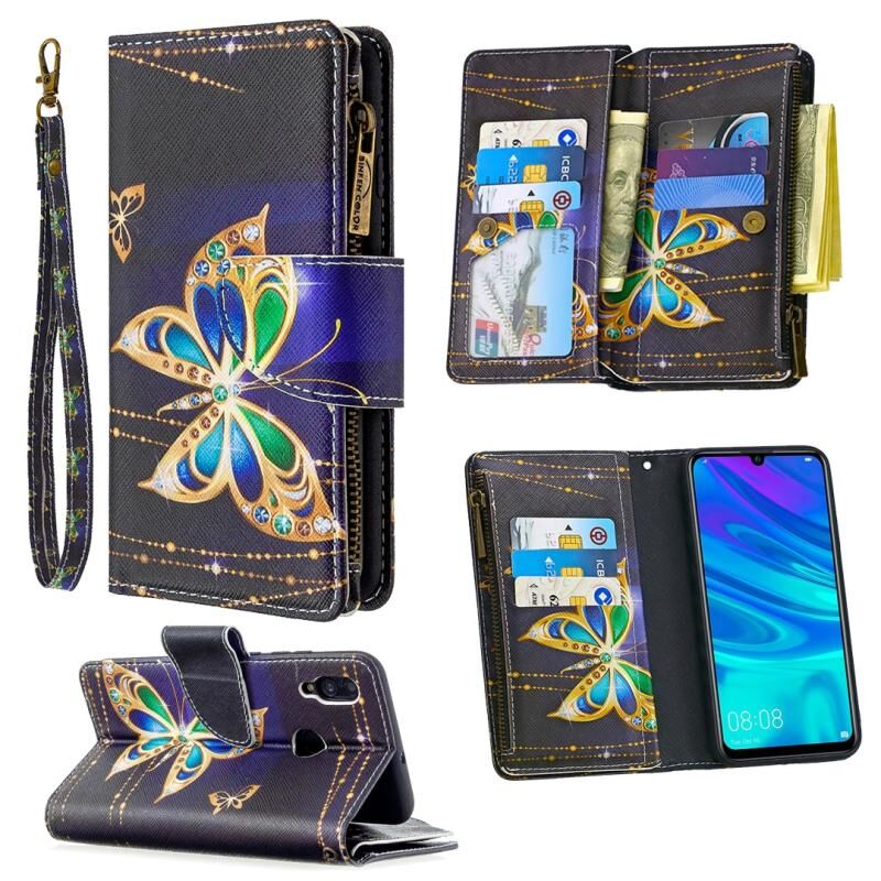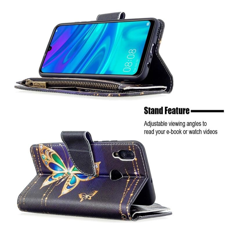Θήκη δέρματος οριζόντιας αναδίπλωσης με φερμουάρ και σχέδιο ζωγραφικής για Huawei P Smart (2019) με βάση στήριξης & υποδοχές καρτών & πορτοφόλι (Μεγάλη Πεταλούδα)