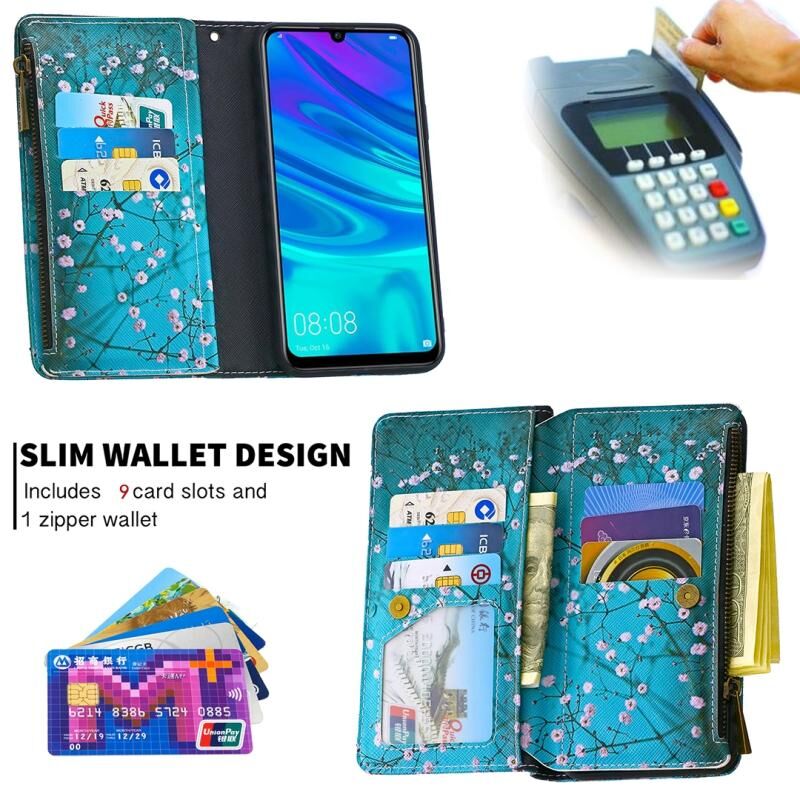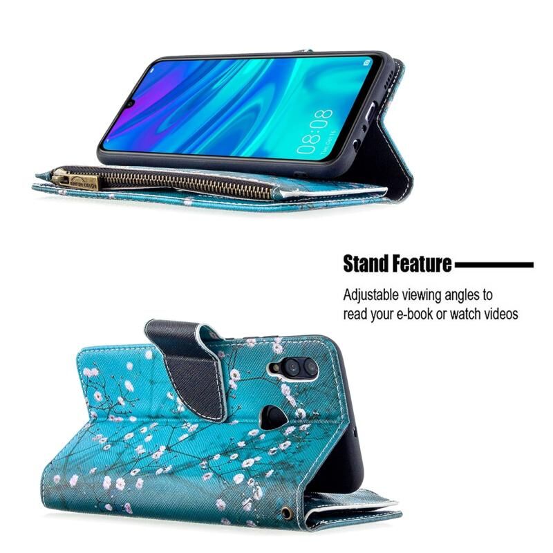 Θήκη δέρματος οριζόντιας αναδίπλωσης με φερμουάρ και σχέδιο ζωγραφικής για Huawei P Smart (2019) με βάση στήριξης & υποδοχές καρτών & πορτοφόλι (Λουλούδι Δαμασκηνιάς)