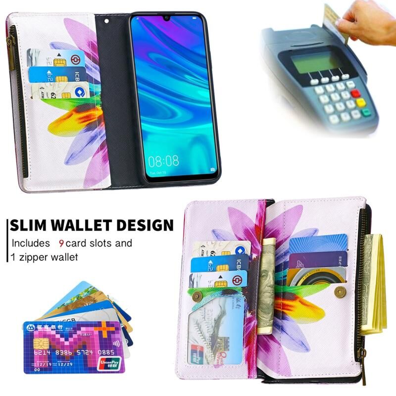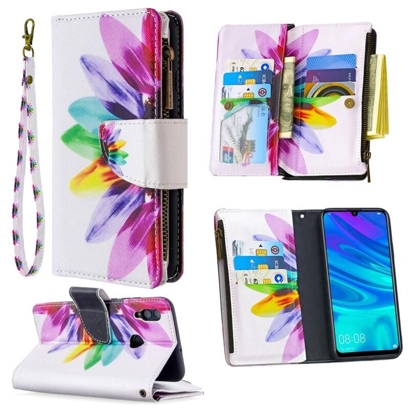 Θήκη Huawei P Smart (2019) με σχέδιο ζωγραφικής, χρώματα, οριζόντια αναδιπλούμενη από δέρμα με φερμουάρ, βάση στήριξης & θήκες για κάρτες & πορτοφόλι (Ηλίανθος)