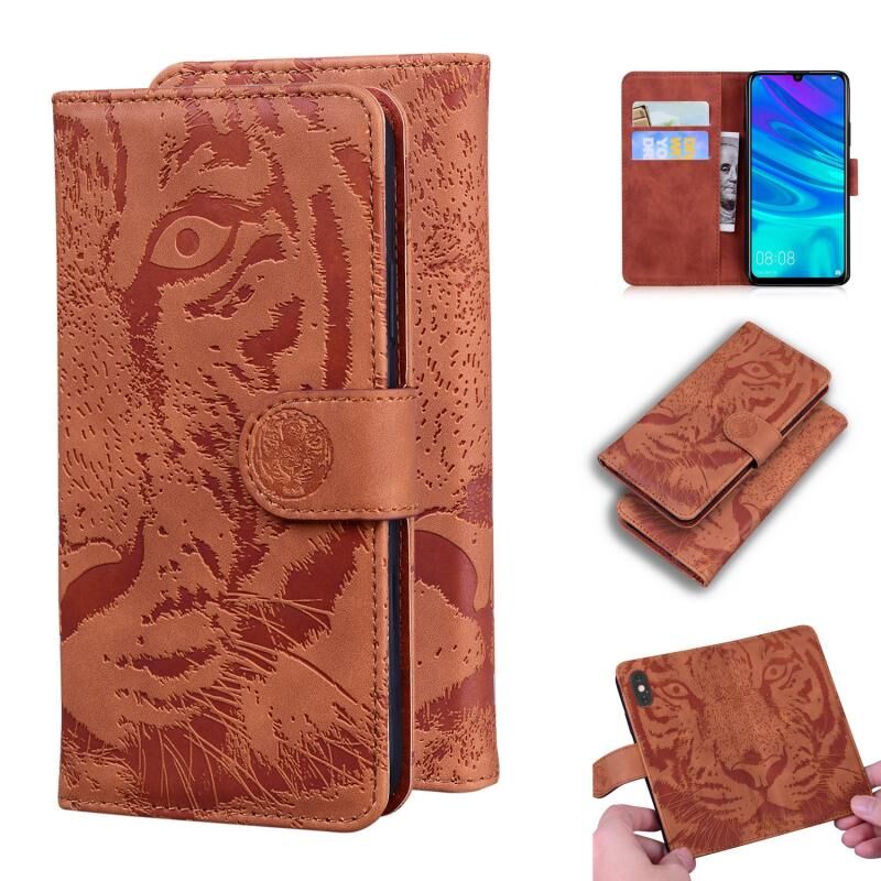 Θήκη δέρματος οριζόντιας αναδίπλωσης με ανάγλυφο μοτίβο τίγρης για Huawei P smart (2019) με βάση στήριξης & υποδοχές καρτών & πορτοφόλι (Καφέ)