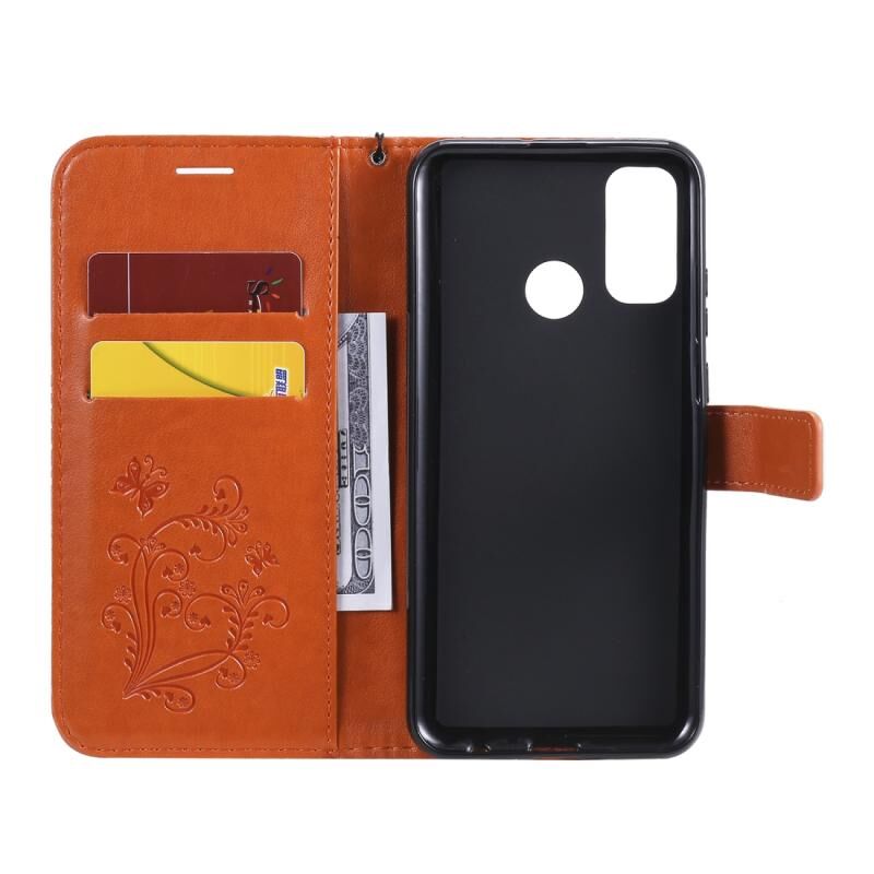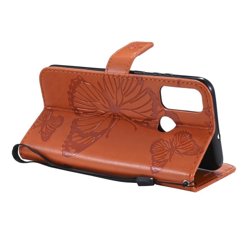 Θήκη δέρματος οριζόντιας αναδίπλωσης με ανάγλυφο σχέδιο 3D πεταλούδων για Huawei P Smart (2020) με βάση στήριξης & υποδοχή κάρτας & πορτοφόλι (Μωβ)