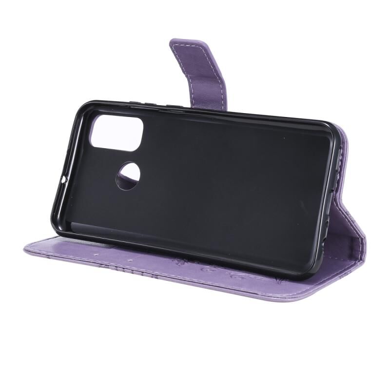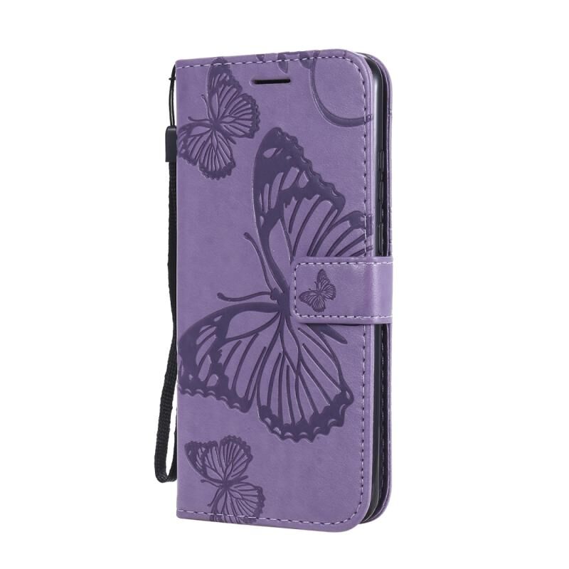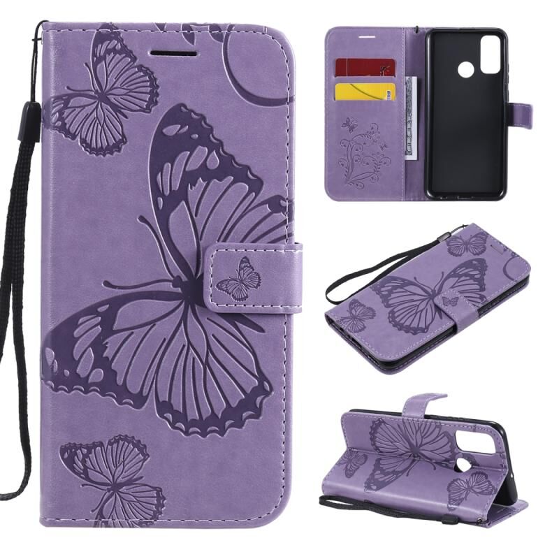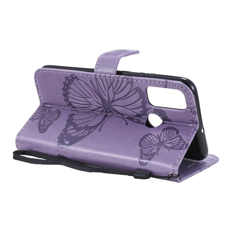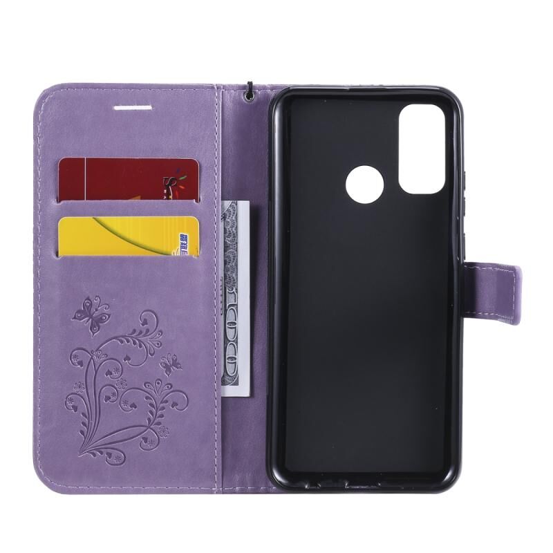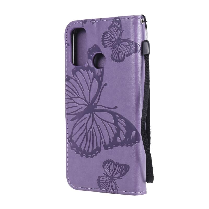 Θήκη δέρματος οριζόντιας αναδίπλωσης με ανάγλυφο σχέδιο 3D πεταλούδων για Huawei P Smart (2020) με βάση στήριξης & υποδοχή κάρτας & πορτοφόλι (Μωβ)