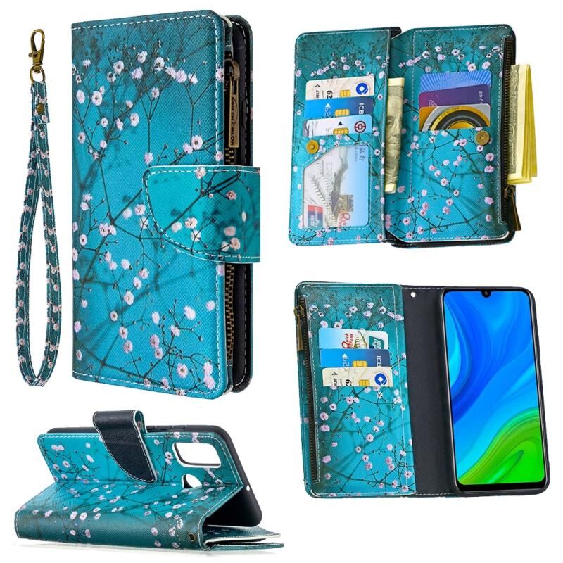 Θήκη Huawei P smart 2020 με έγχρωμο σχέδιο, οριζόντια, δερμάτινη με φερμουάρ, με βάση & θήκες για κάρτες & πορτοφόλι (Λουλούδι Δαμασκηνιάς)