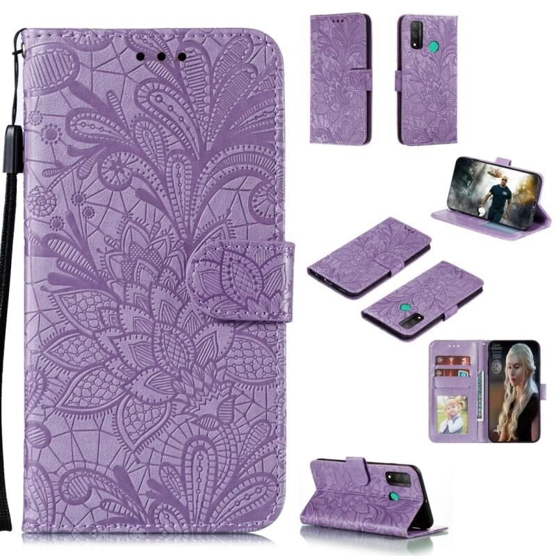 Θήκη Huawei P Smart 2020, δερμάτινη, οριζόντια αναδιπλούμενη με ανάγλυφο σχέδιο δαντέλας λουλουδιών, με βάση στήριξης, θήκες για κάρτες, πορτοφόλι, κορνίζα φωτογραφιών & λουρί (Χρυσό Ρόδινο).