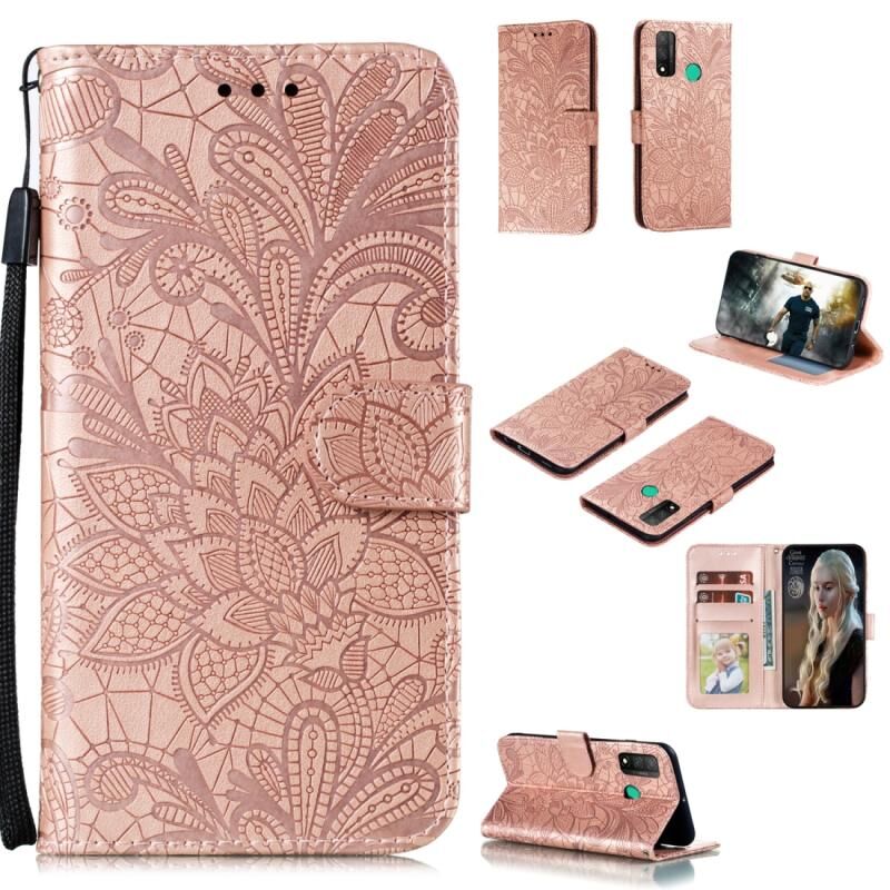 Θήκη Huawei P Smart 2020, δερμάτινη, οριζόντια αναδιπλούμενη με ανάγλυφο σχέδιο δαντέλας λουλουδιών, με βάση στήριξης, θήκες για κάρτες, πορτοφόλι, κορνίζα φωτογραφιών & λουρί (Χρυσό Ρόδινο).