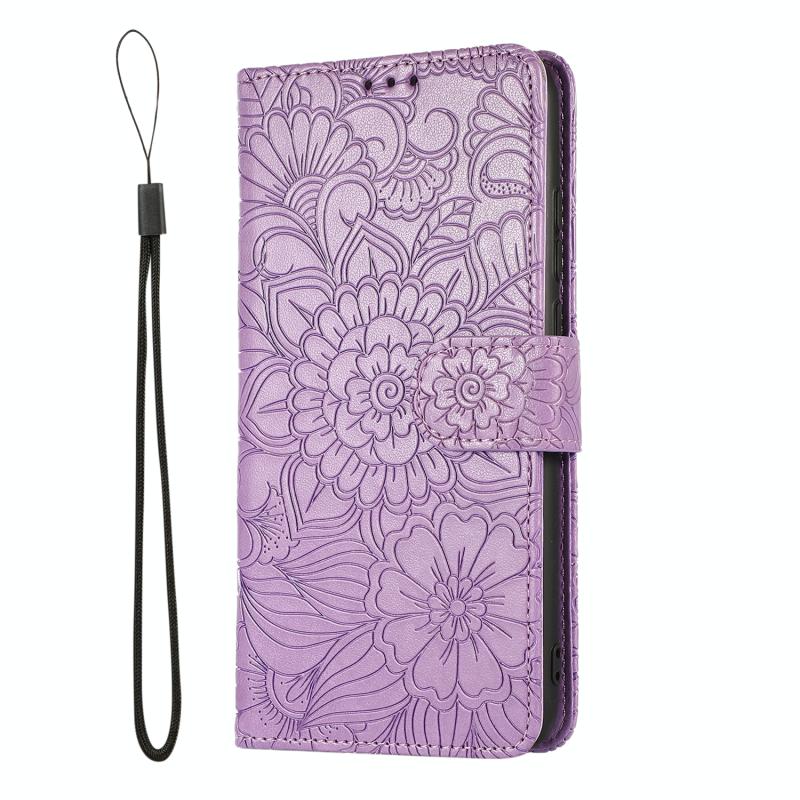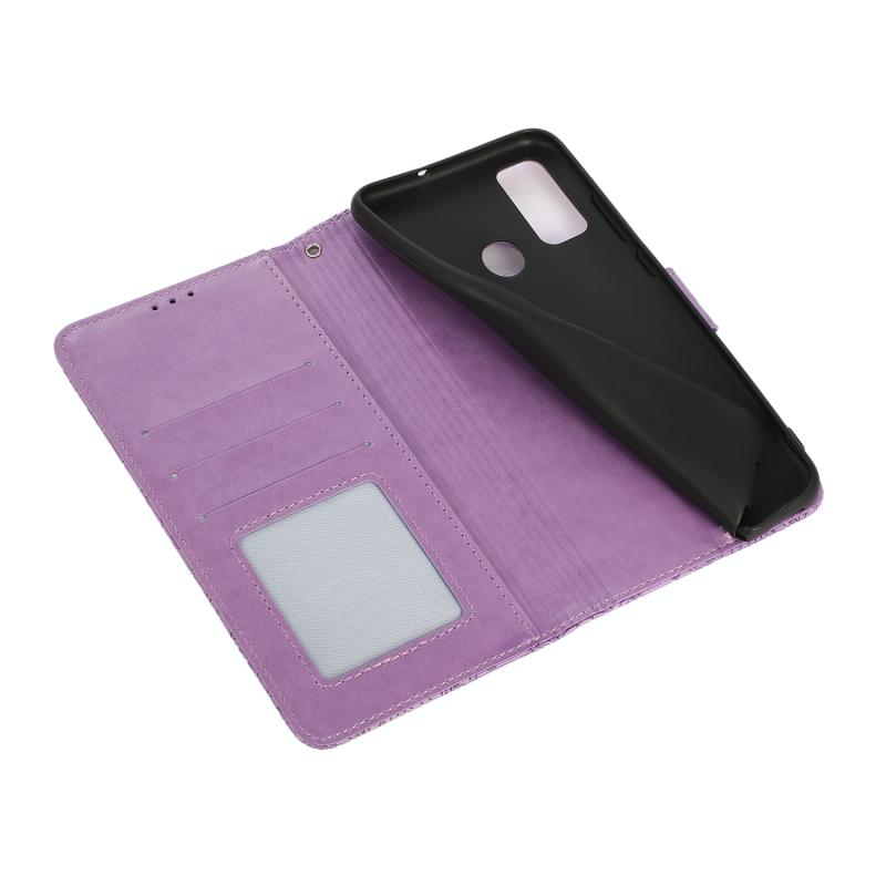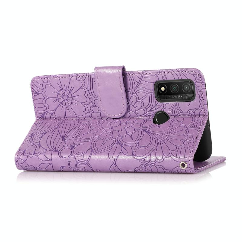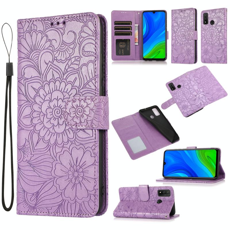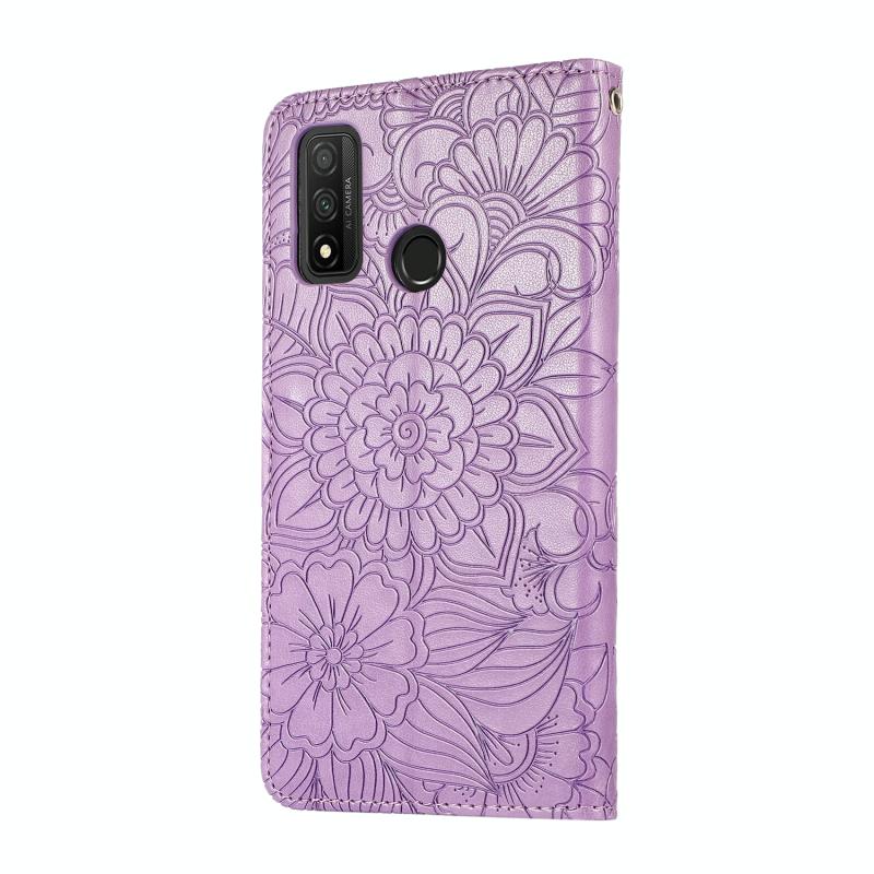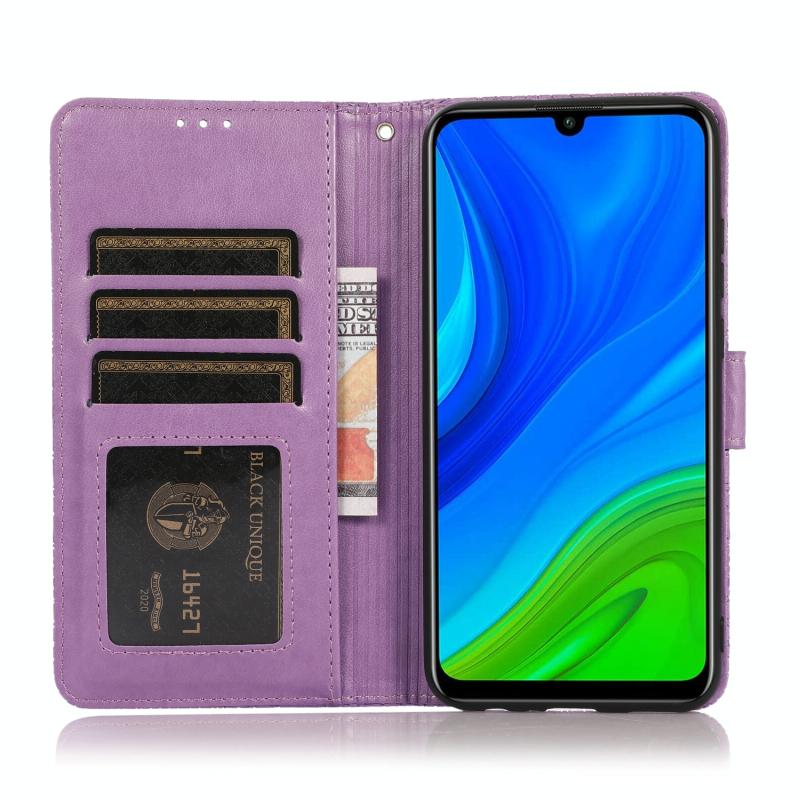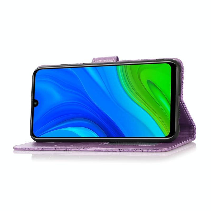 Θήκη Huawei P smart 2020 με υφή δέρματος, ανάγλυφο ηλιοτρόπιο, οριζόντια, δερμάτινη με βάση στήριξης, θήκες καρτών, πορτοφόλι & λουρί (Μωβ)