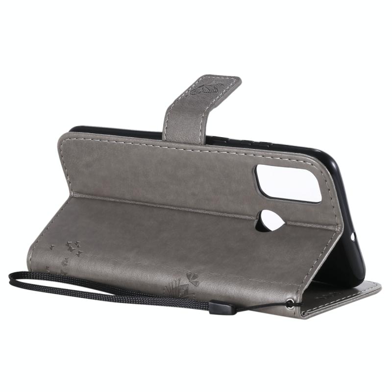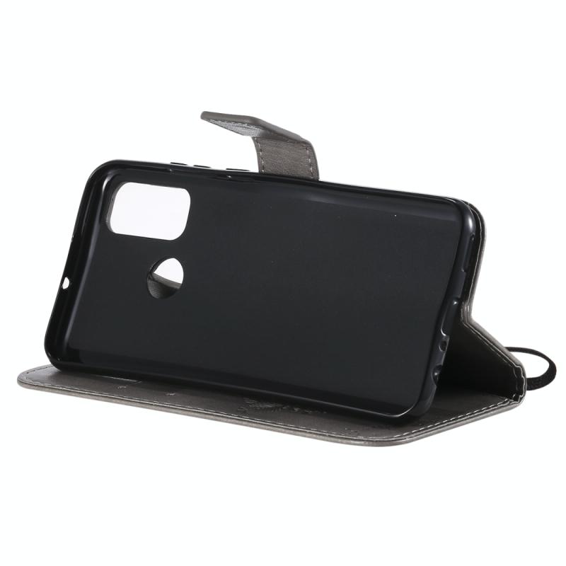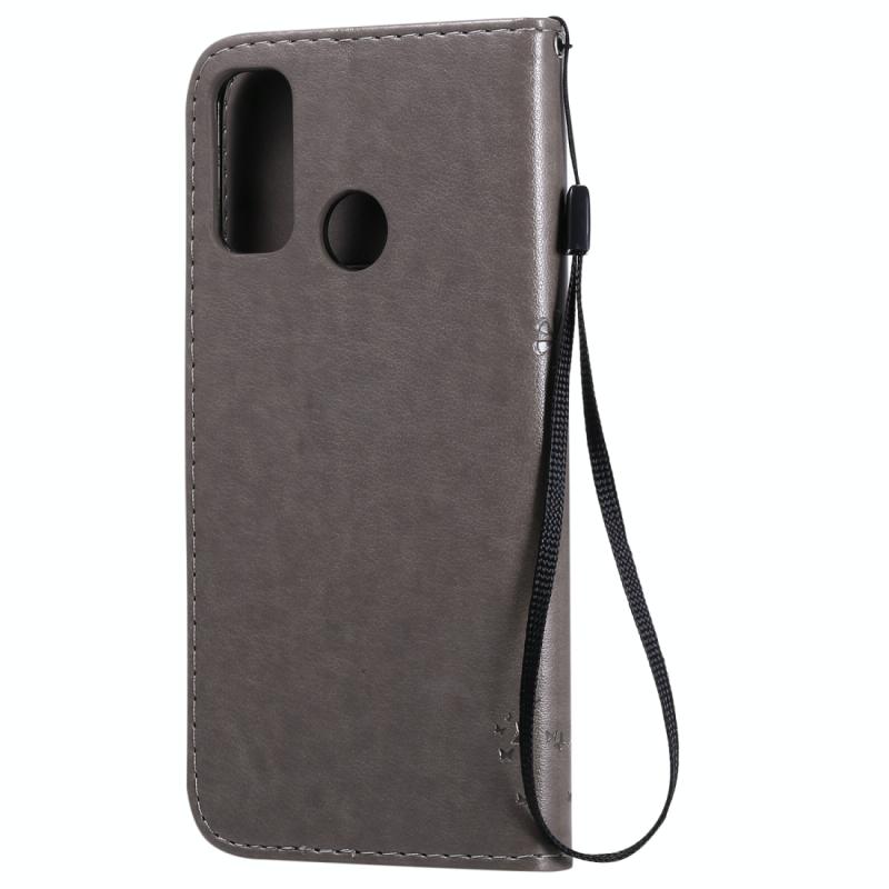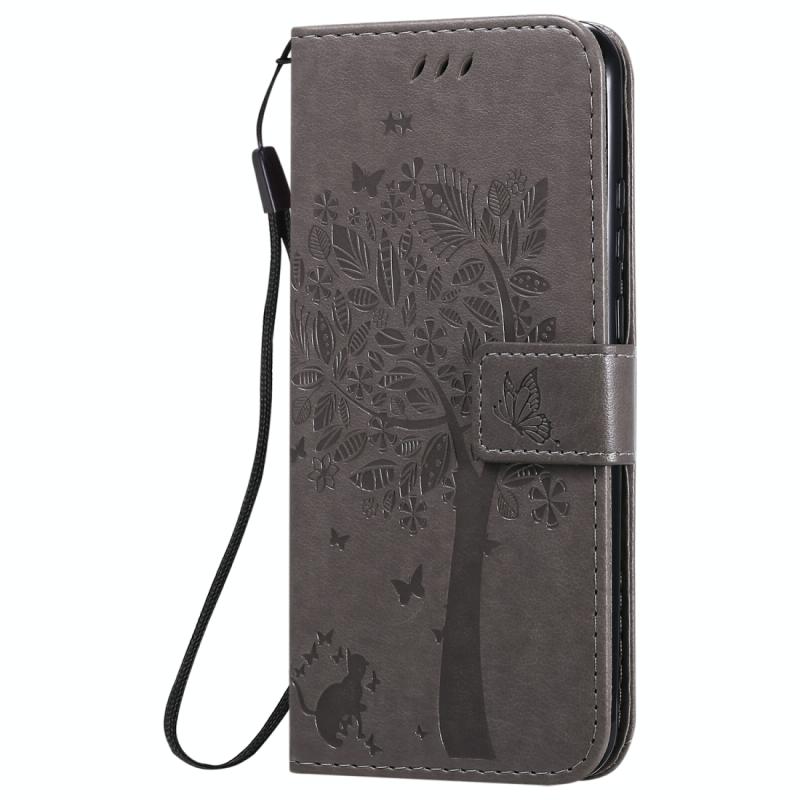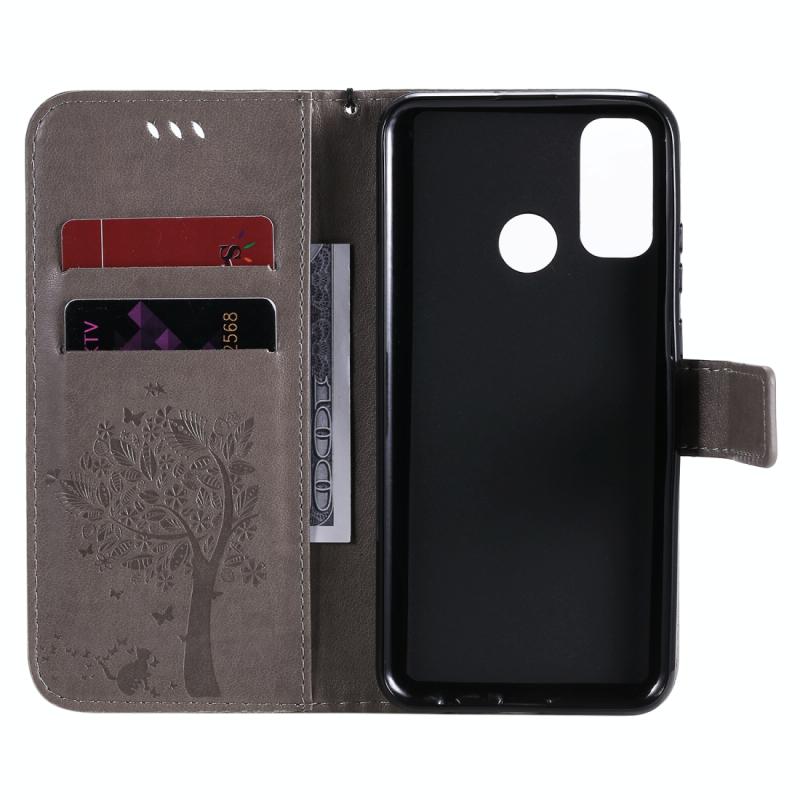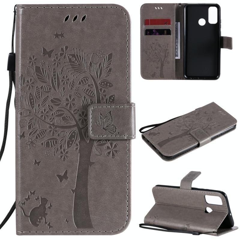 Θήκη Huawei P Smart 2020, Δερμάτινη, Οριζόντια, με ανάγλυφο σχέδιο Δέντρου & Γάτας, με βάση στήριξης, θήκες για κάρτες, πορτοφόλι & λουρί (Γκρι)